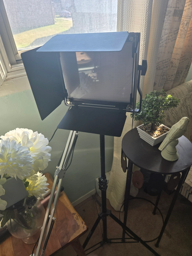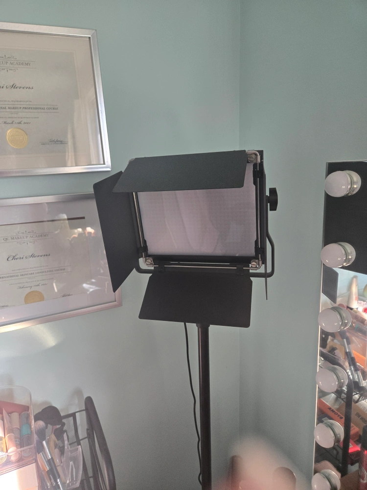Selling a makeup studio light with a stand. It's in great condition and perfect for makeup application or photography. It provides excellent lighting for any setting. Have 2 available with slide out filter and adjustable flaps plus carrying case. Brand Neewer.