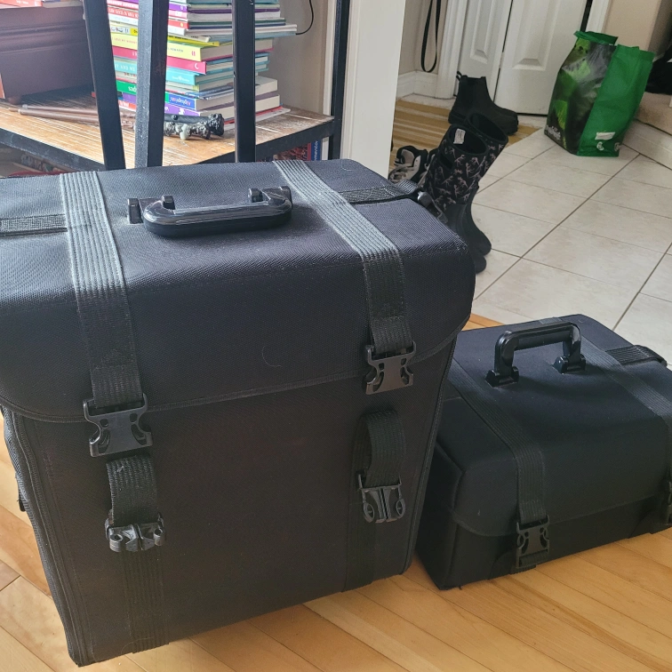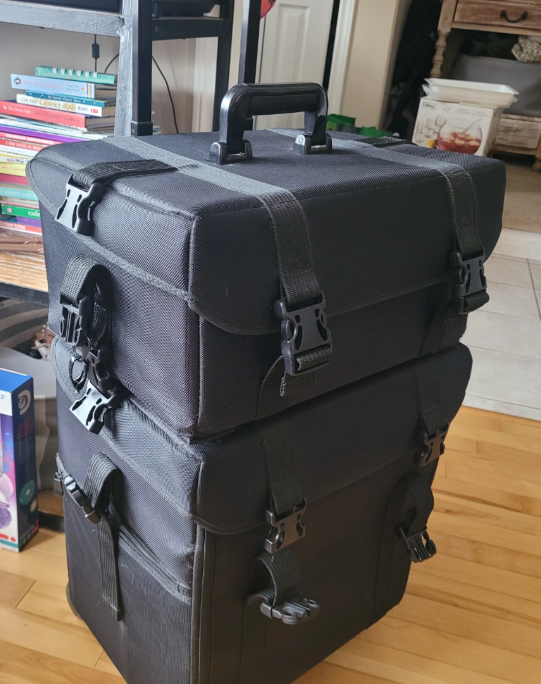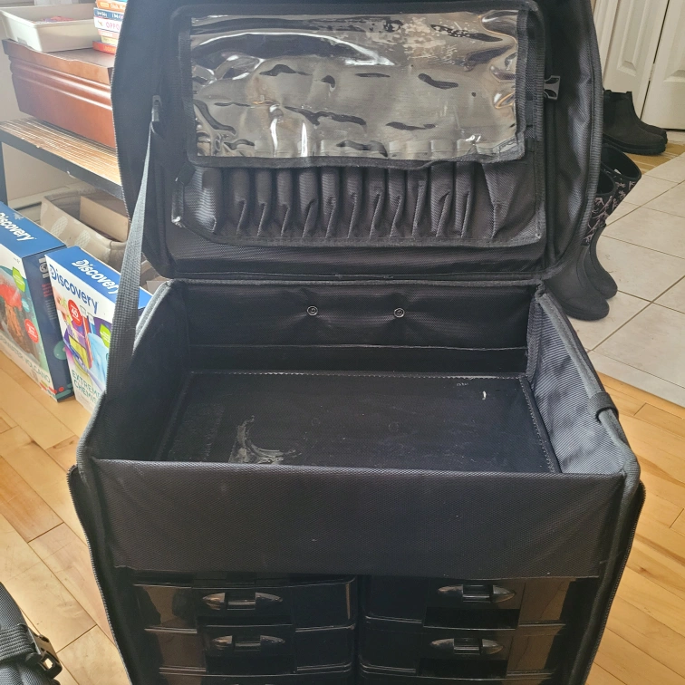 Black rolling makeup train case. Two-piece set: large and small. Multiple compartments and drawers. Ideal for professional makeup artists or personal use. Was $500+ new - high end quality