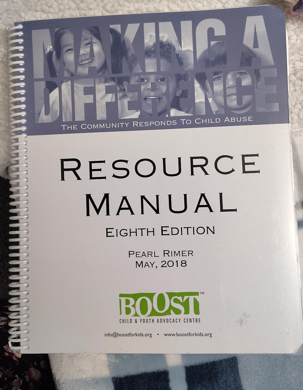 Selling a resource manual titled 'Making a Difference: The Community Responds to Child Abuse'. This is the Eighth Edition, published in May 2018 by Pearl Rimer. It's a resource manual from BOOST Child & Youth Advocacy Centre.