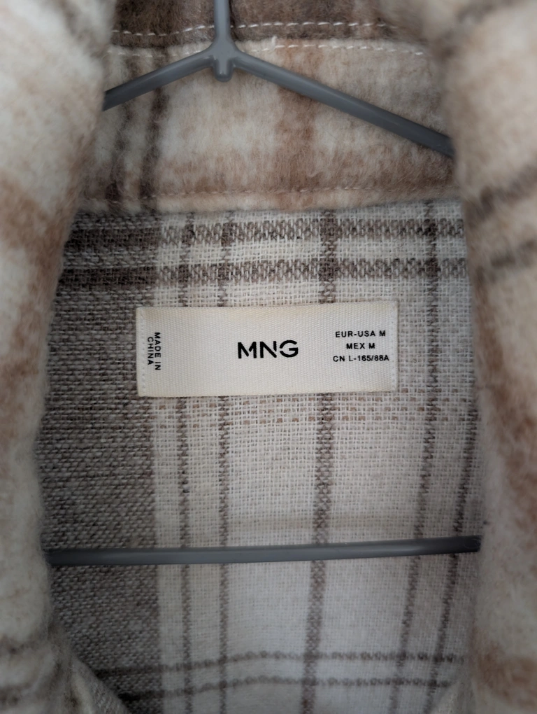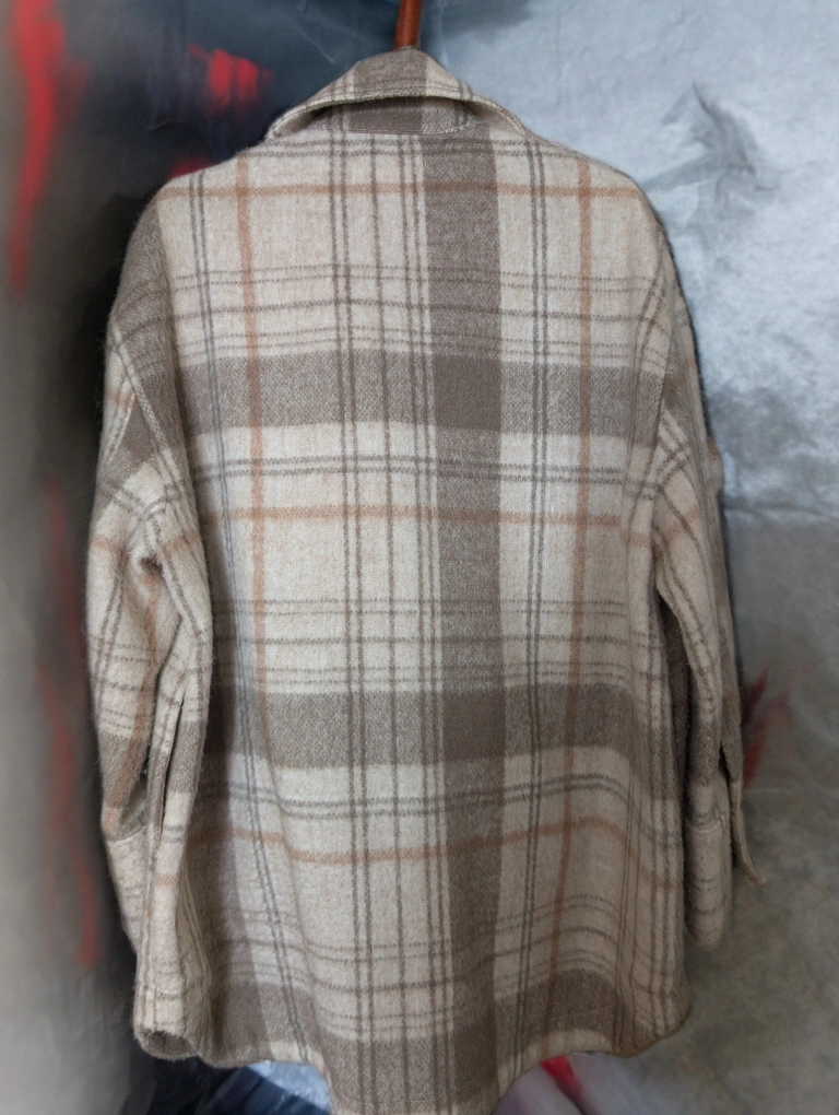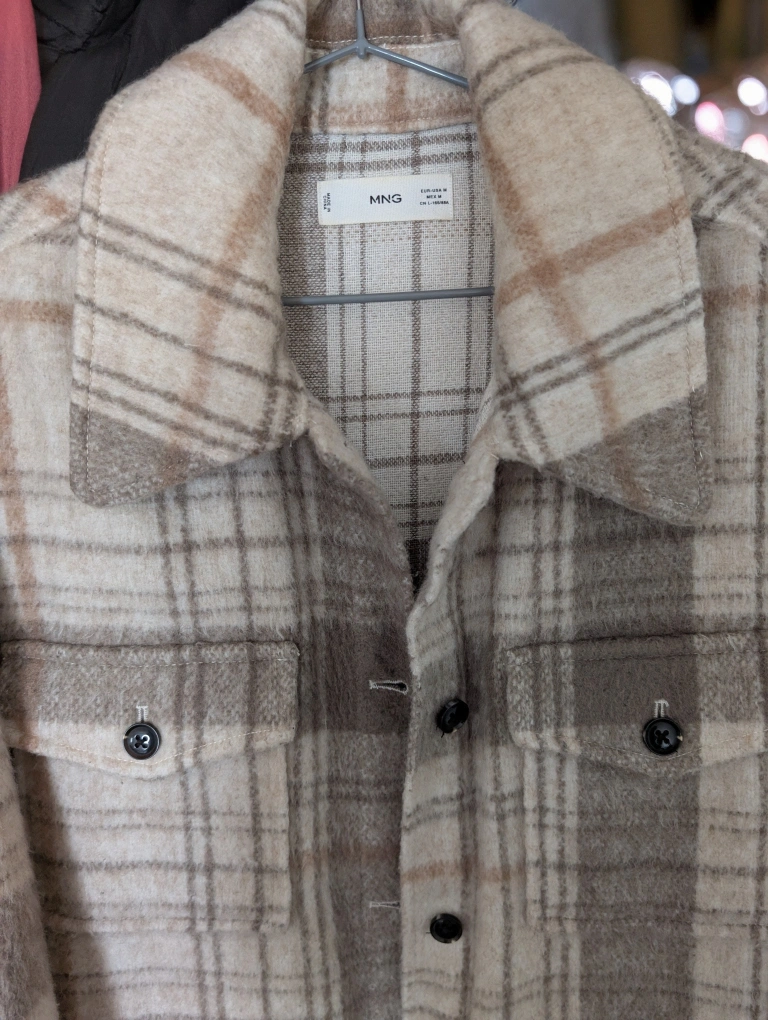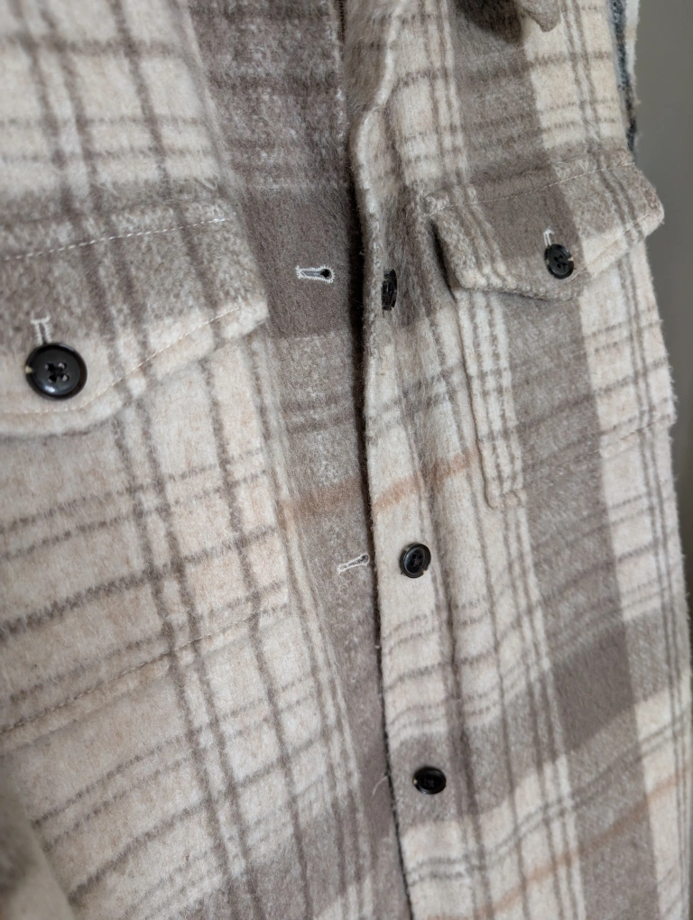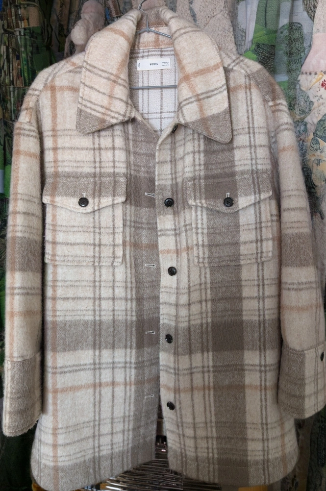 Warm beige and brown plaid flannel shirt jacket. Medium size. Button closure. Two chest pockets. pick-up: 252 Elgin St.