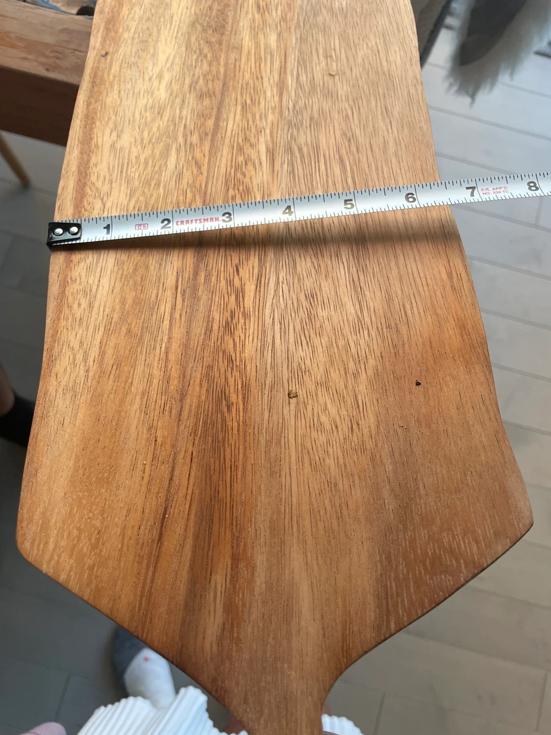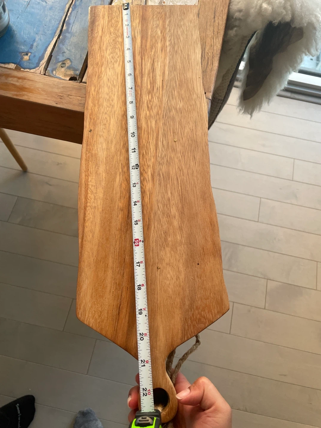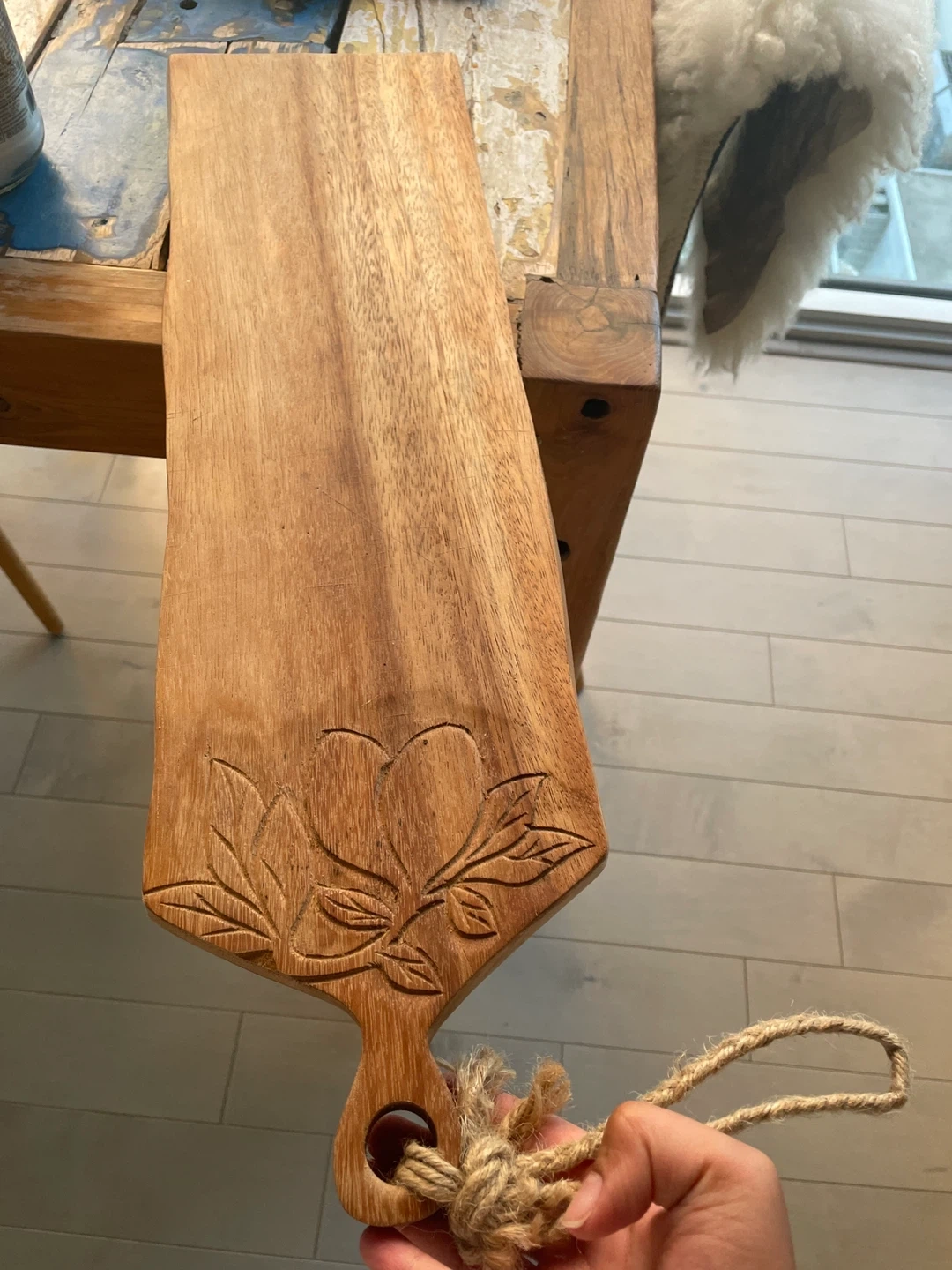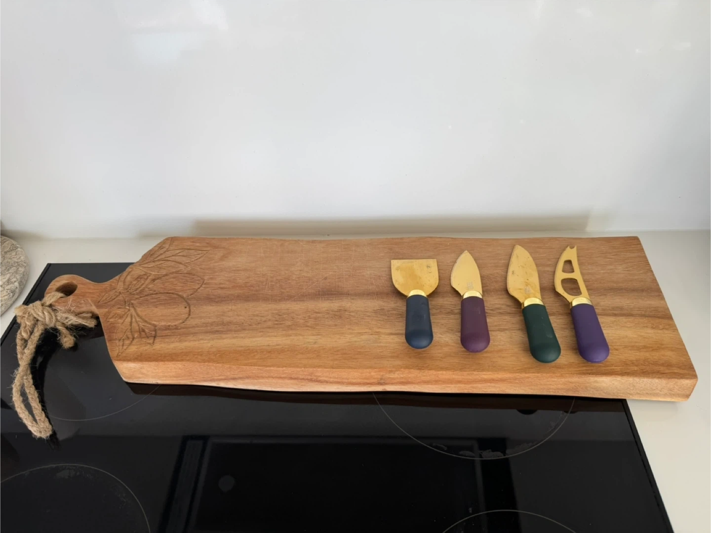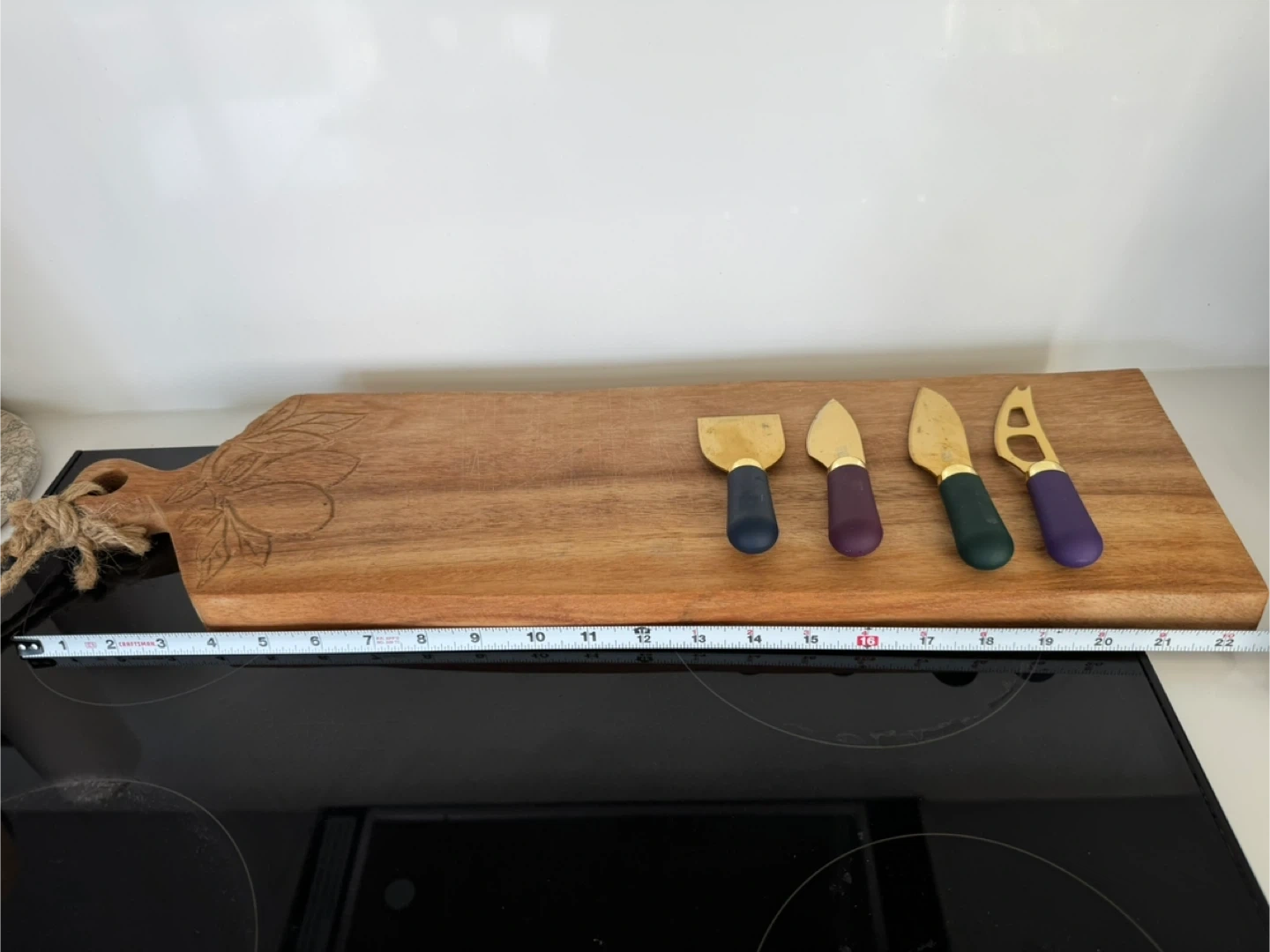 Selling a lovely wooden serving board, perfect for entertaining! It comes with a set of four cheese knives with gold-toned blades and colourful handles. The board has a beautiful floral design carved into the wood. It measures approximately 22 inches in length and 8 inches in width.