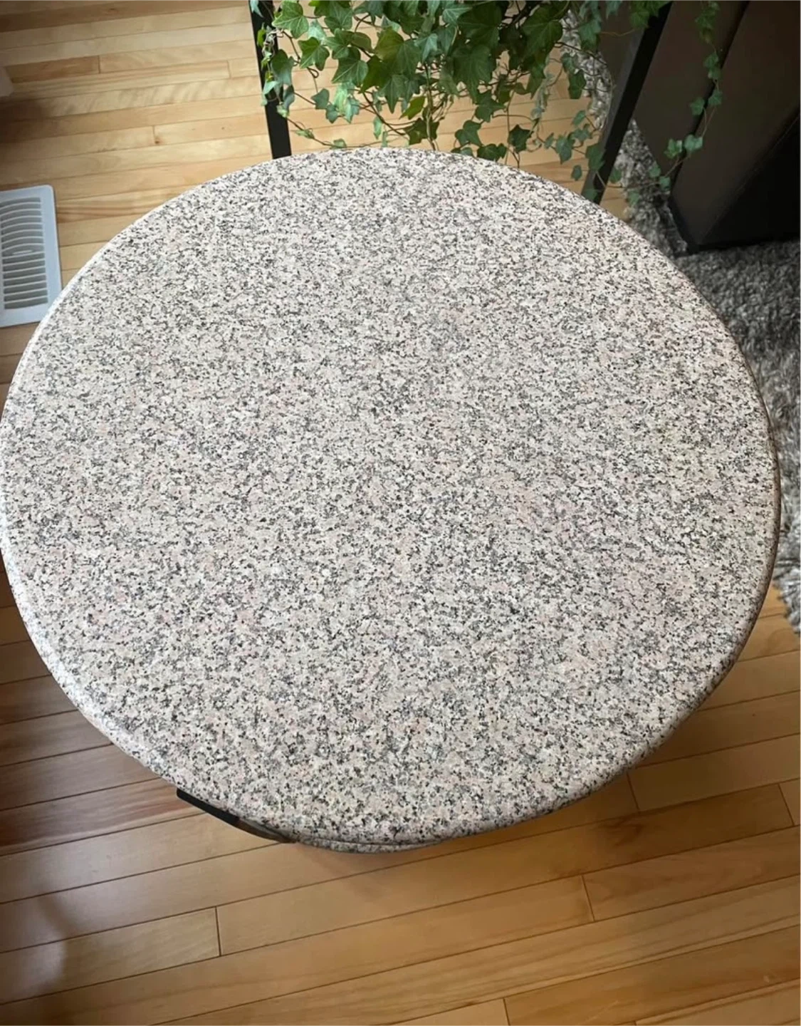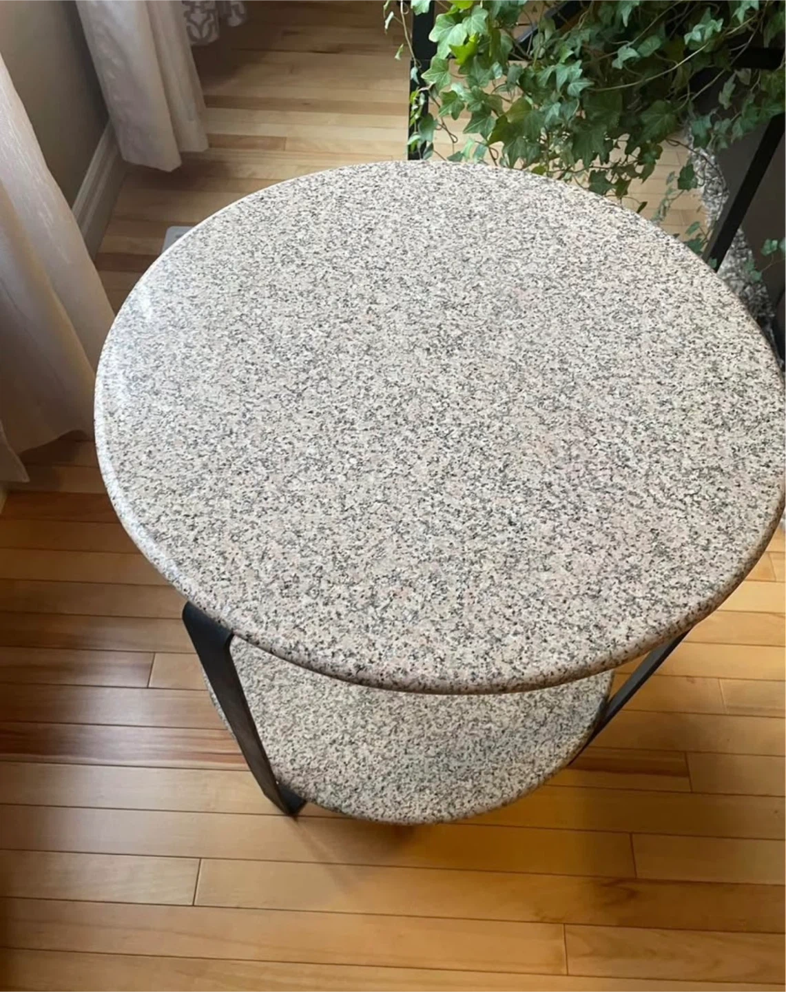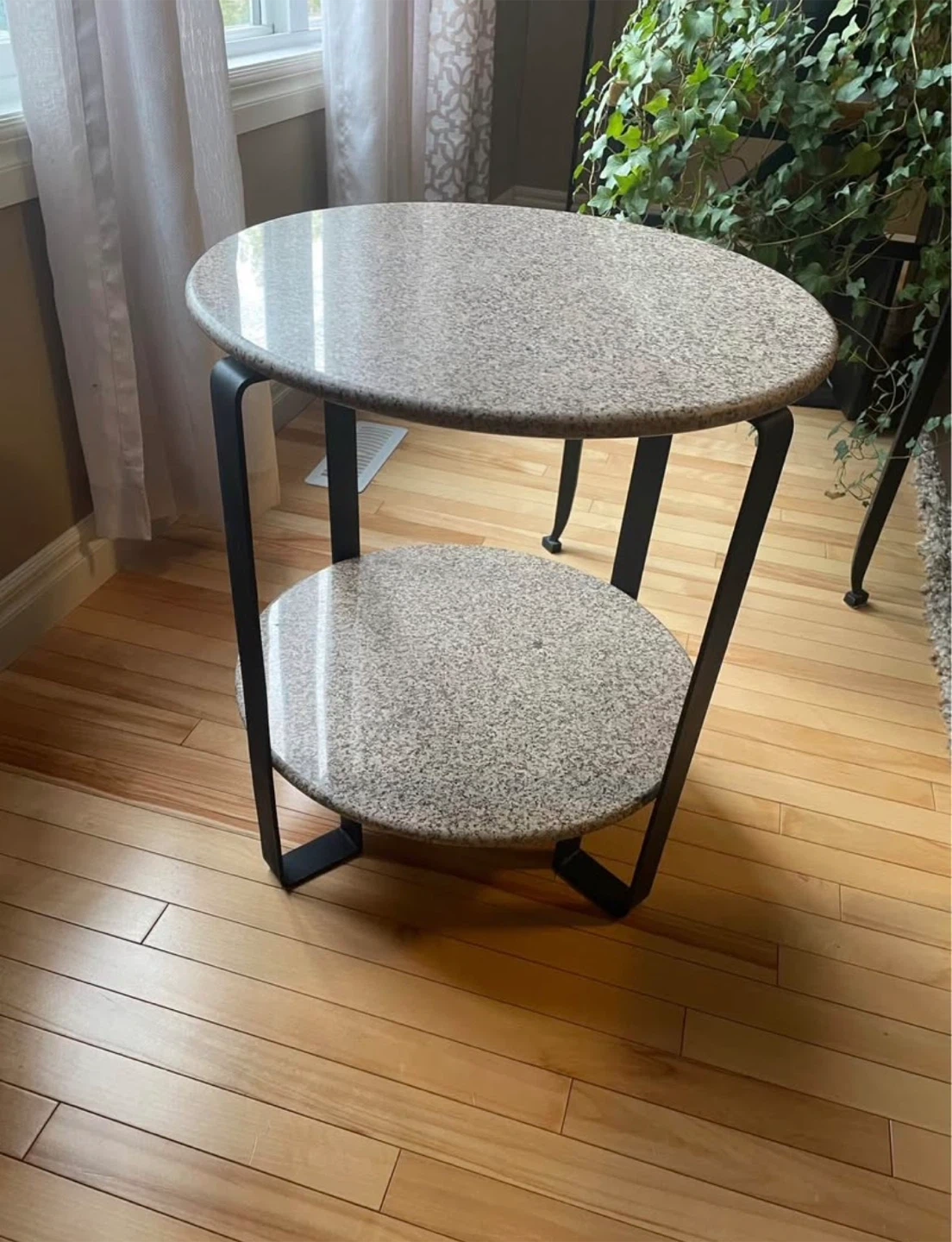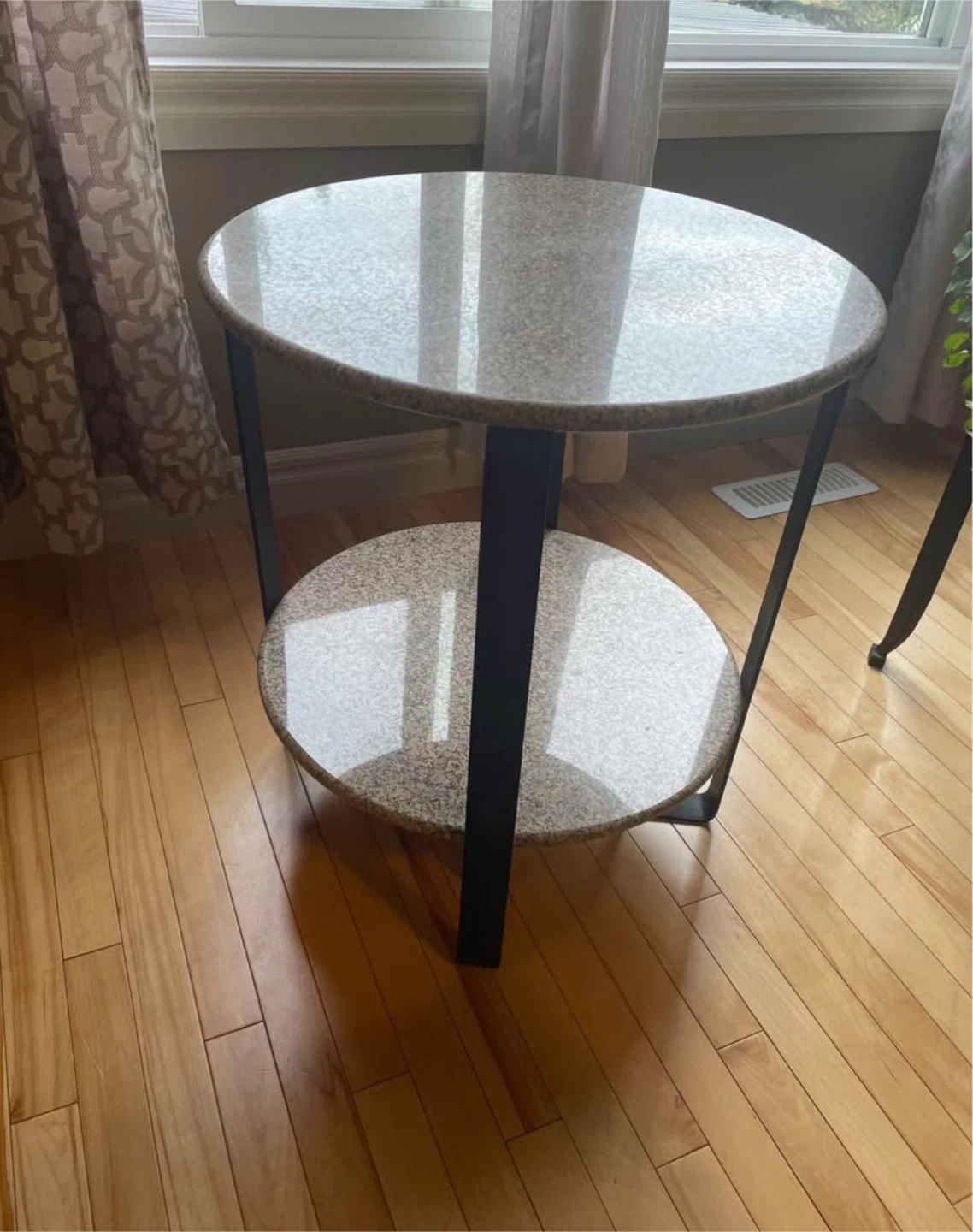 Handcrafted accent table, speckled pattern on both the top and bottom shelves. Marble Table with Black Metal Legs. (Quite heavy) Height 23' Width 20" Excellent condition, payed over 200.00 Pick up in Airdrie.