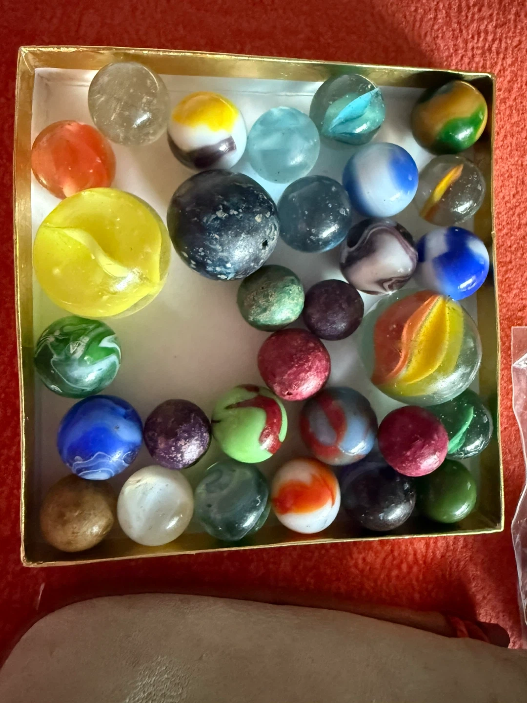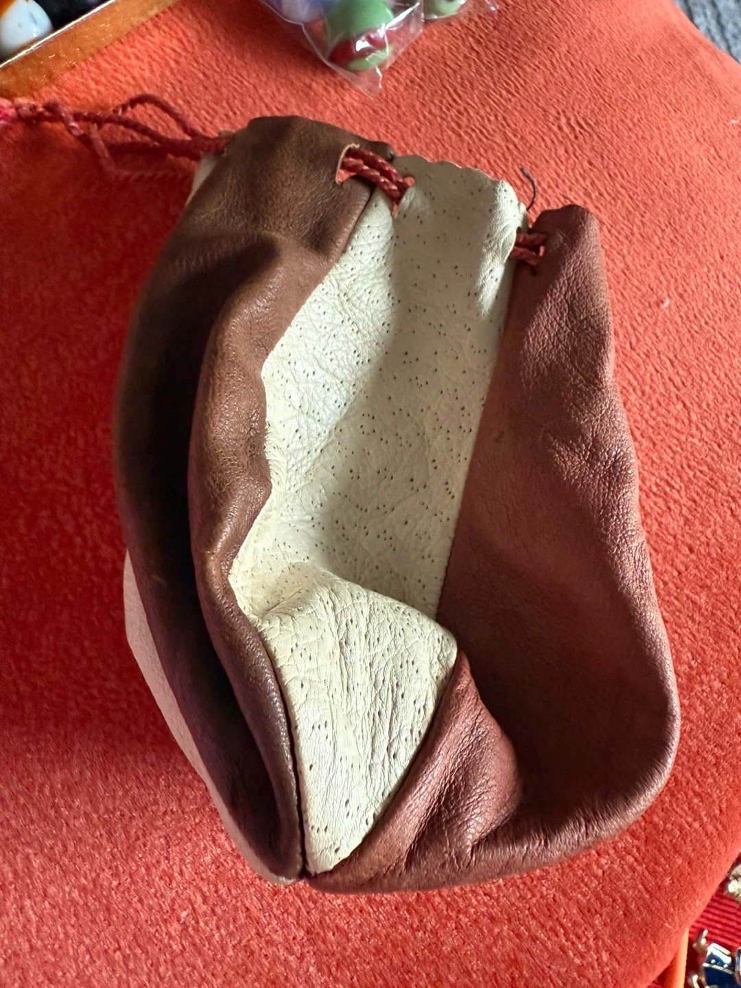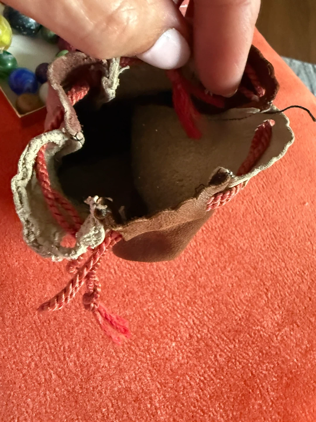A collection of marbles in various colours. They come with a brown and beige leather pouch with a drawstring