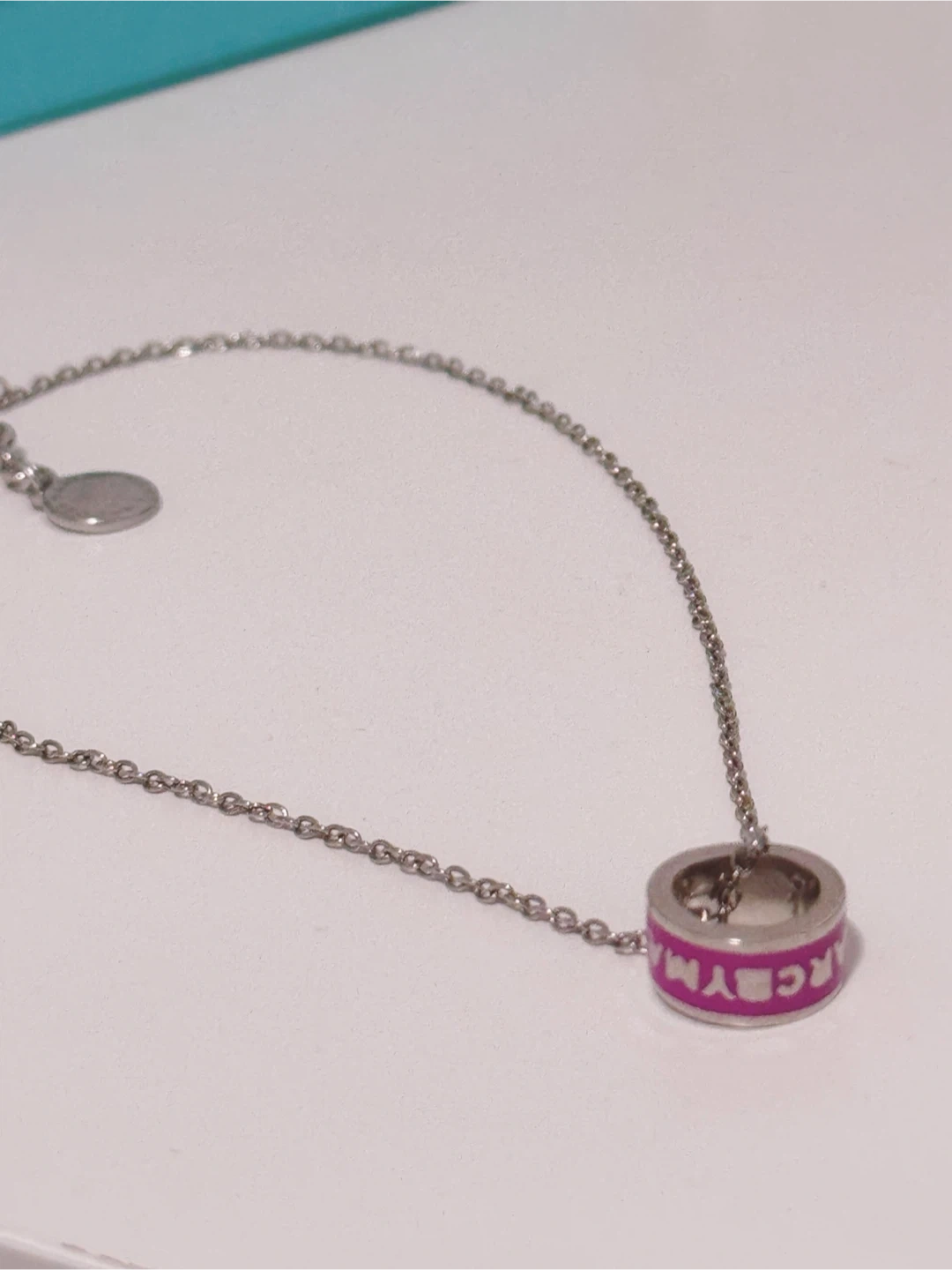Selling a cute Marc by Marc Jacobs necklace! It features a silver chain and a pink pendant with the brand name on it. It's in great condition and ready for a new home