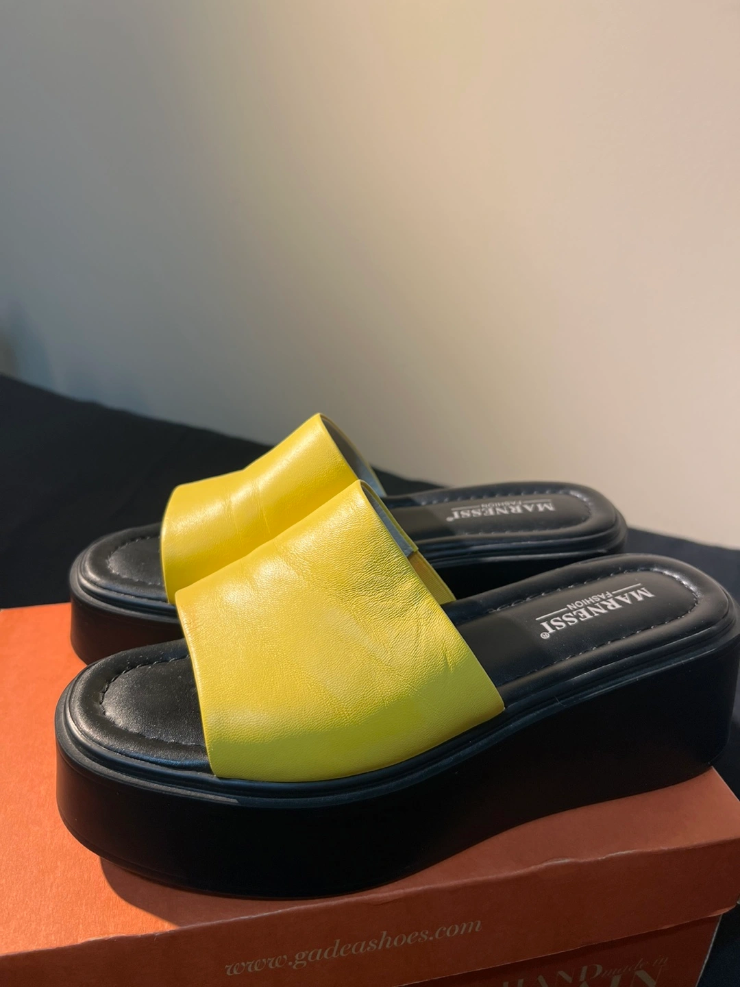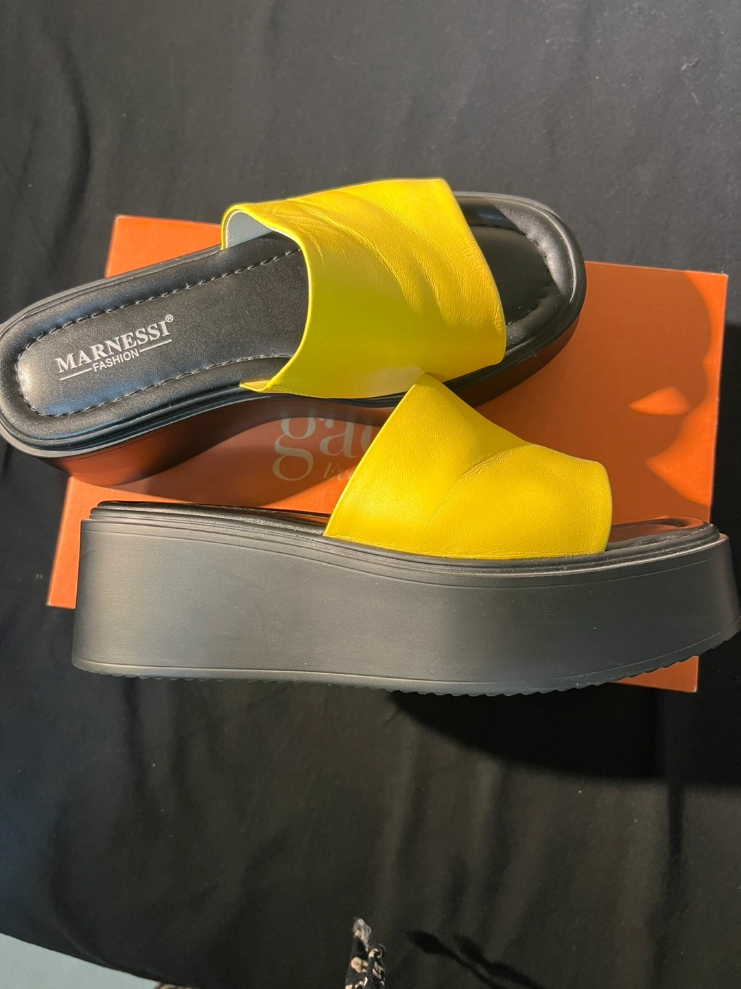 These Marnessi Fashion platform slides are a vibrant yellow and ready for summer! They feature a comfortable platform sole and a stylish, upper leather,minimalist design. The shoes are in excellent condition.