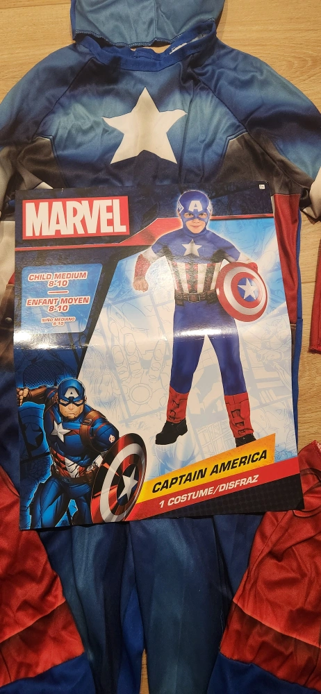 Selling a Captain America costume for kids! This is a child's size medium, suitable for ages 8-10. It includes all the pictured pieces to complete the look. Perfect for dress-up or Halloween!