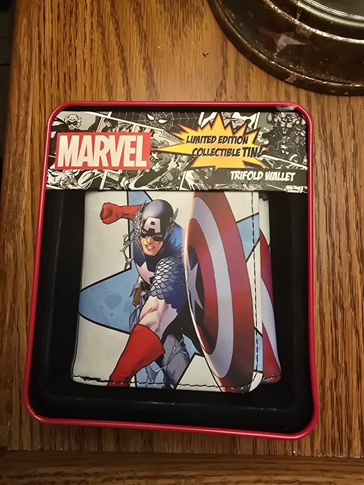 Selling a Marvel Captain America limited edition collectible tin trifold wallet. It comes in its original tin, making it a great item for collectors! The tin states that it was originally priced at $16.99.