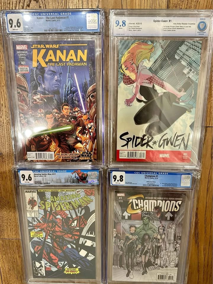 Will sell individual books. Pickup south burlington Take everything for $185 ($80 off) - I don’t have that much room on individual purchases, just on selling the lot Champions 1 fade variant $125 Kanan 1 $40 Spider Gwen 1 variant $50 ASM 317 $50