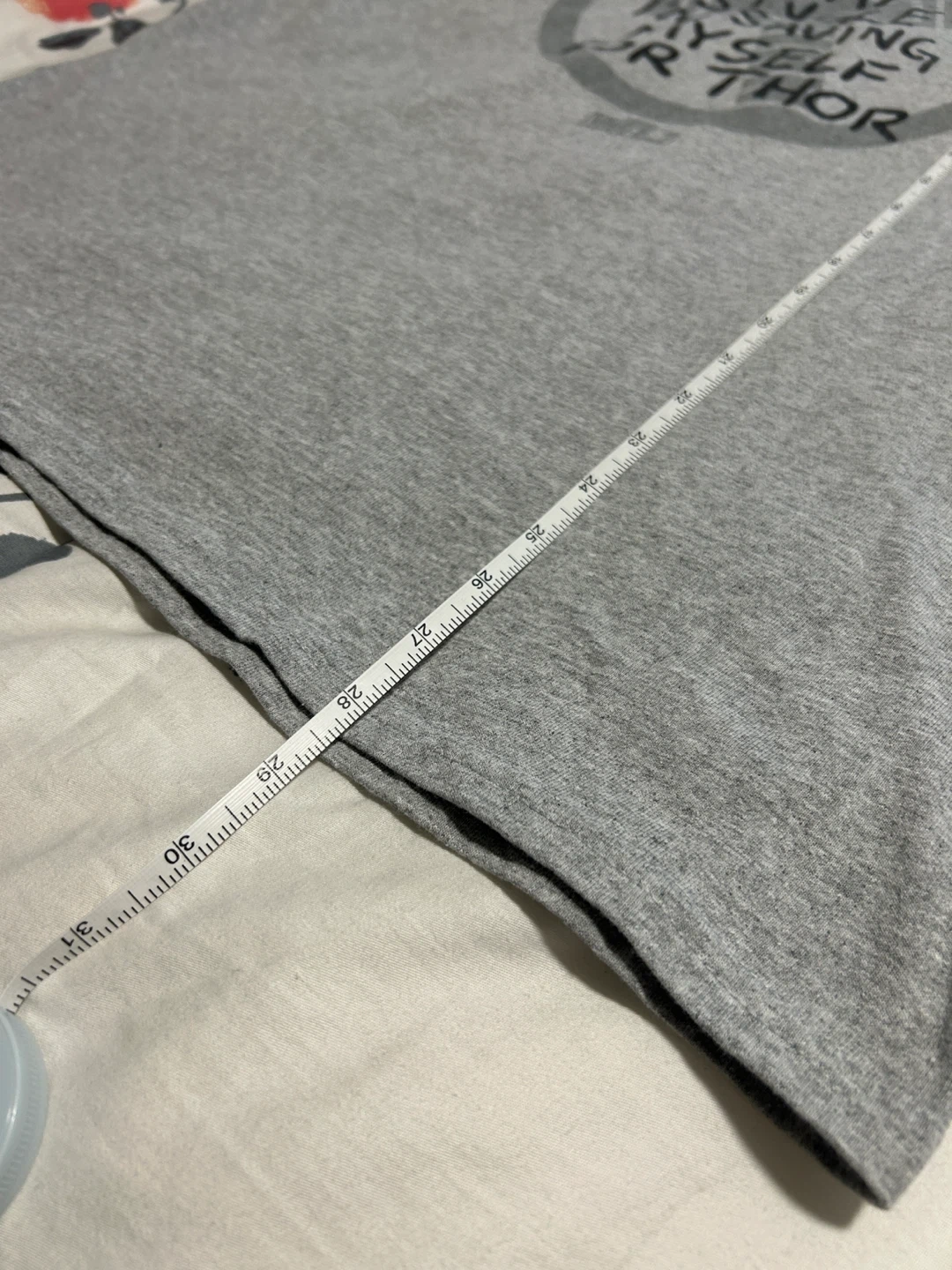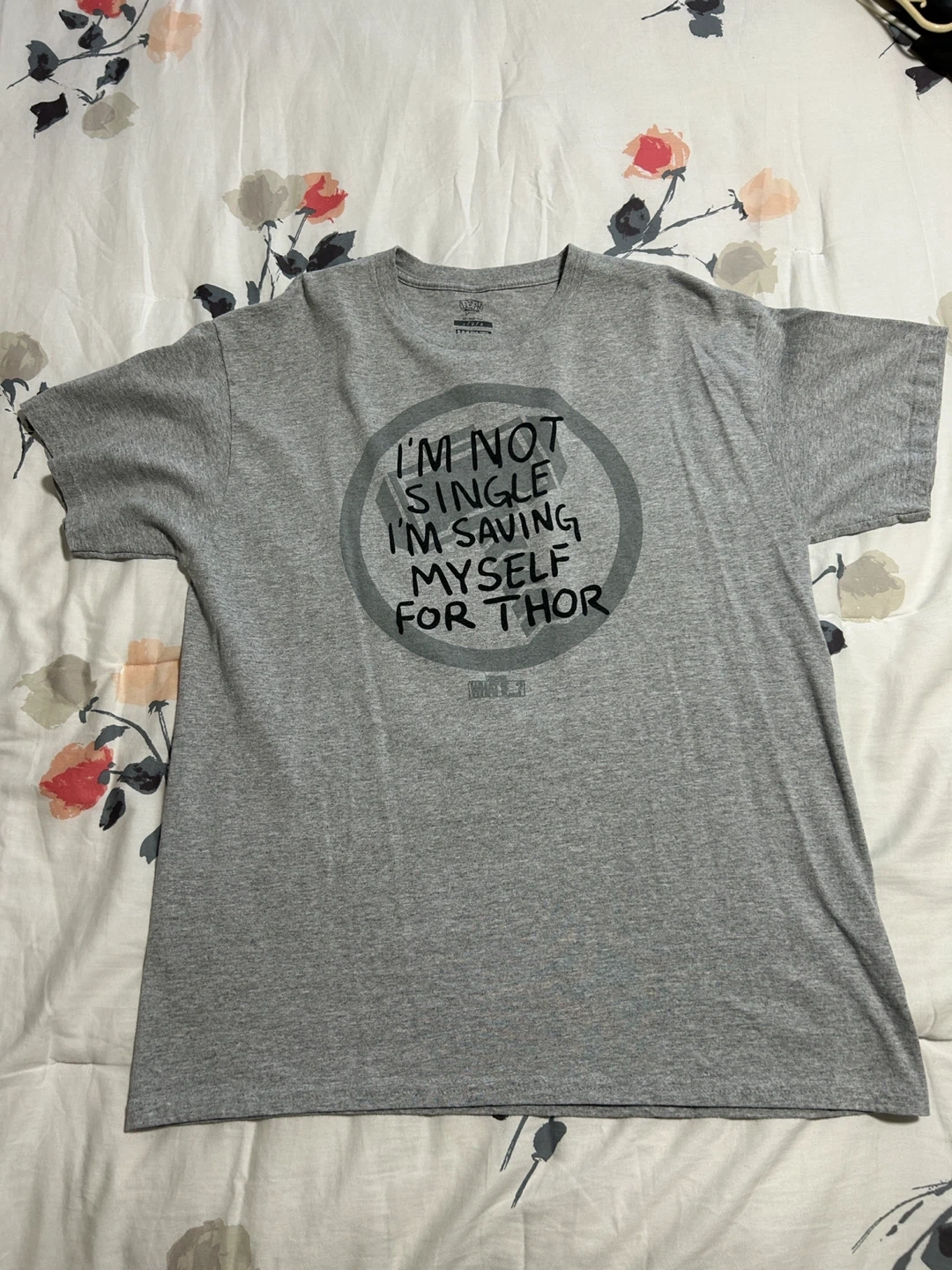 Selling a grey Marvel T-shirt. It's a size large and in great condition. The shirt features the quote 'I'm not single, I'm saving myself for Thor'. Made of 90% cotton and 10% polyester Center is 21” across Length is approximately 28” Smoke Free/Pet Free home Check my other listings for more clothing items!