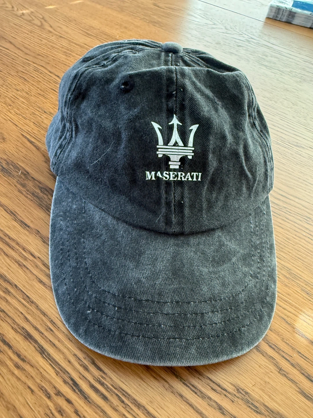 Selling a black Maserati baseball cap. It's in great condition and has the Maserati logo on the front. Perfect for any car enthusiast!