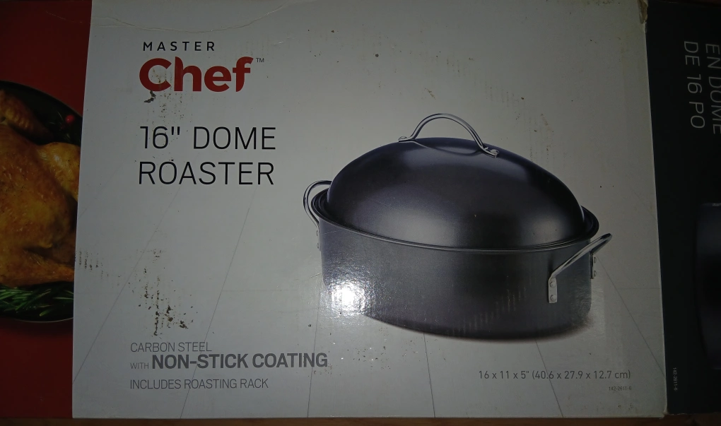 I'm selling a new Master Chef 16" Dome Roaster! It's still in its original packaging and has only been used one time slightly. - 16" Dome Roaster - Carbon steel with non-stick coating - Includes roasting rack - Dimensions: 16 x 11 x 5" (40.6 x 27.9 x 12.7 cm) Perfect for holiday cooking!
