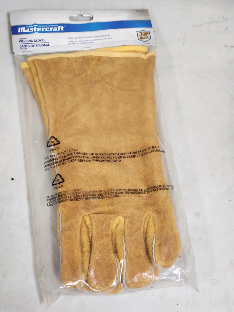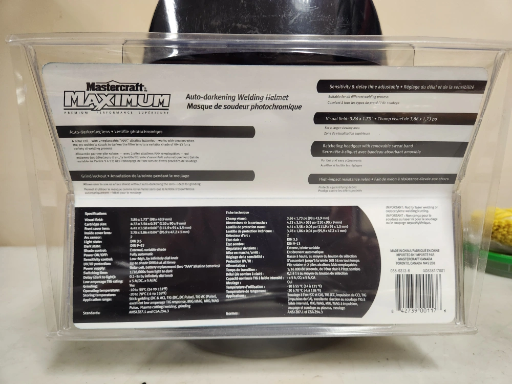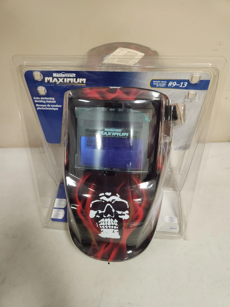 I'm selling a brand new Mastercraft Maximum auto-darkening welding helmet, still in its original packaging! It features a variable shade lens (#9-13) and auto-darkening technology. Also included are Mastercraft welding gloves to protect your hands from heat and welding sparks