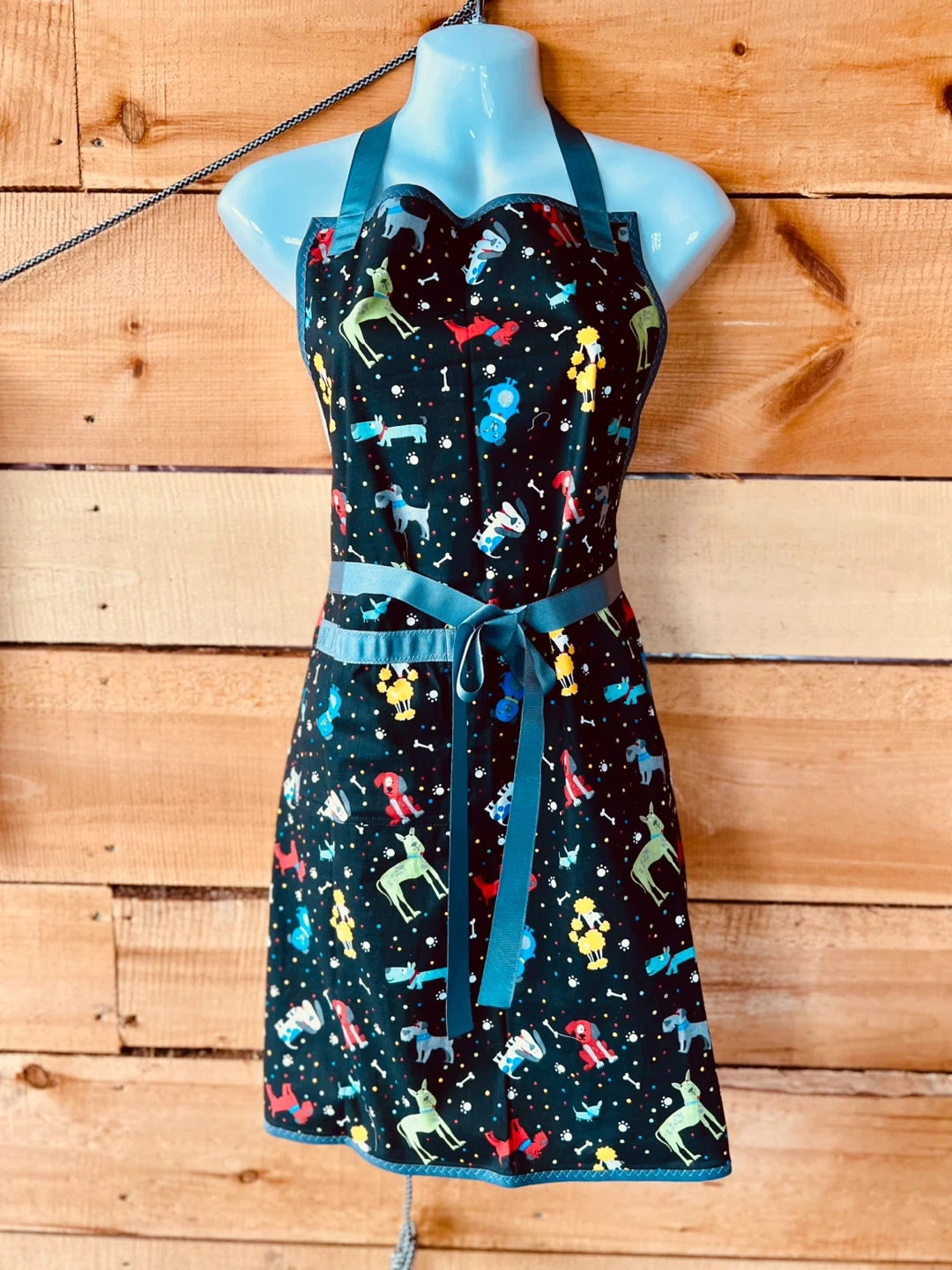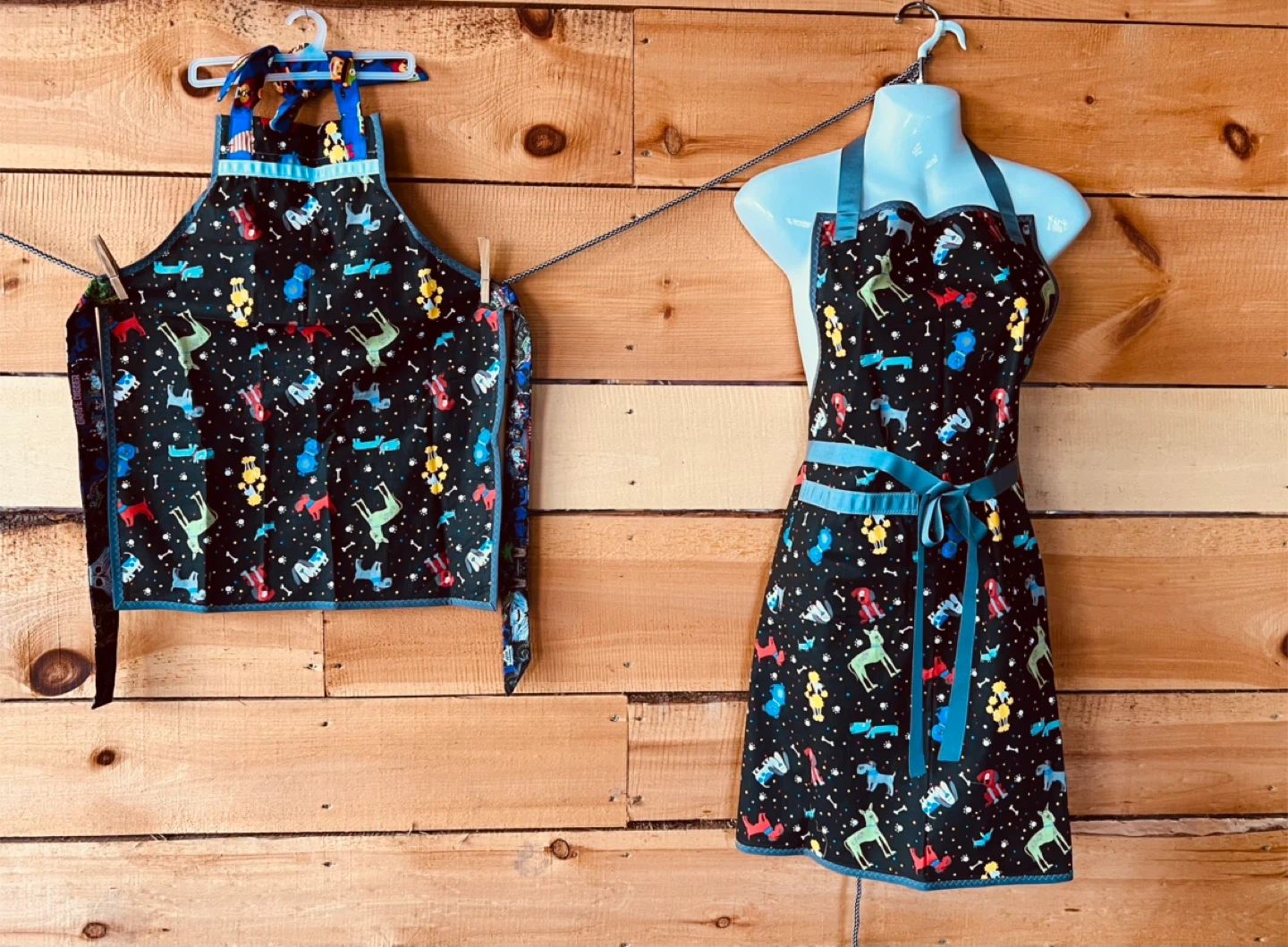 I'm selling a matching set of aprons, one adult size and one child size. They feature a cute dog print on a black background with blue trim. Perfect for baking or crafting with your little one! Handmade by me!!!