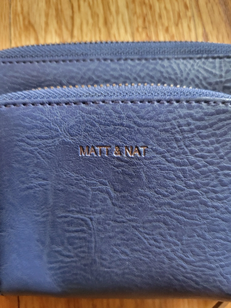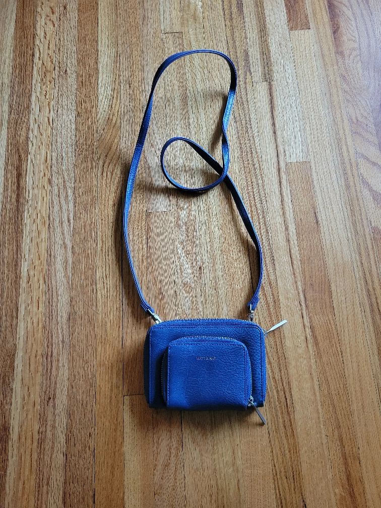 A lovely blue Matt & Nat crossbody bag! It's the perfect size for carrying your essentials while keeping your hands free. The colour is a beautiful shade of blue that goes with everything. It's in great condition and ready for a new home!