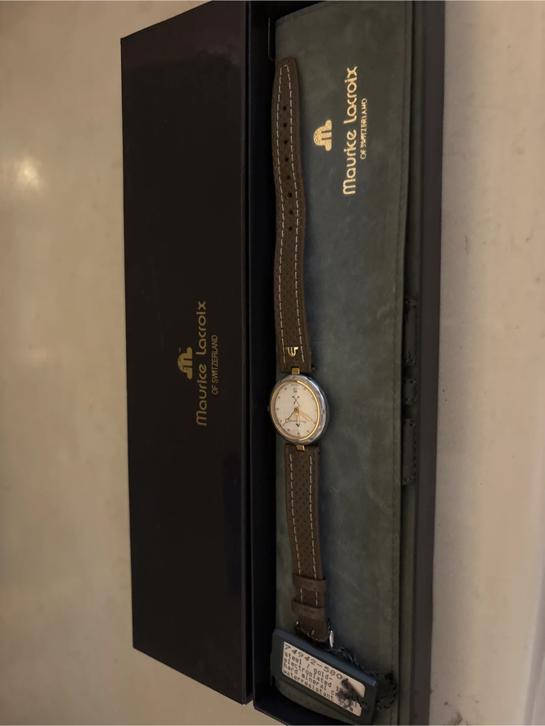 Selling a Maurice Lacroix ladies watch. It comes with its original box and packaging. The watch has a brown leather band and a gold-tone case. It's in great condition and ready for a new home Need change the new battery
