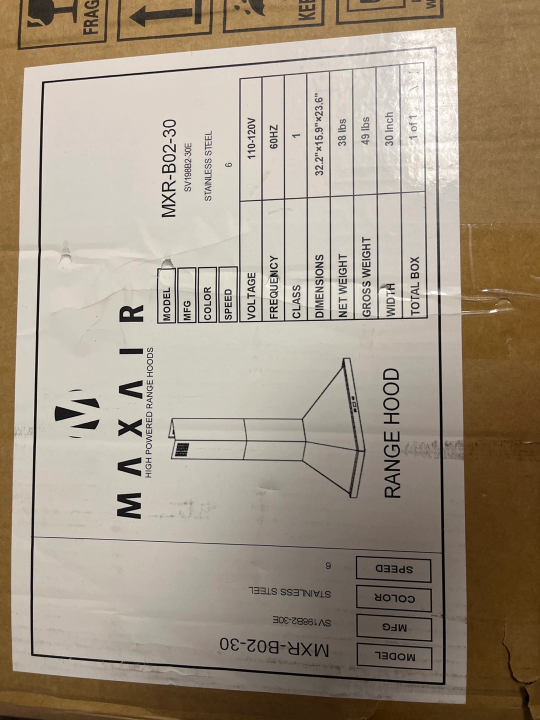 Selling a MAXAIR high-powered range hood, model MXR-B02-30. It's brand new in the box! The range hood is stainless steel and has a width of 30 inches. Its dimensions are 32.2" x 15.9" x 23.6".