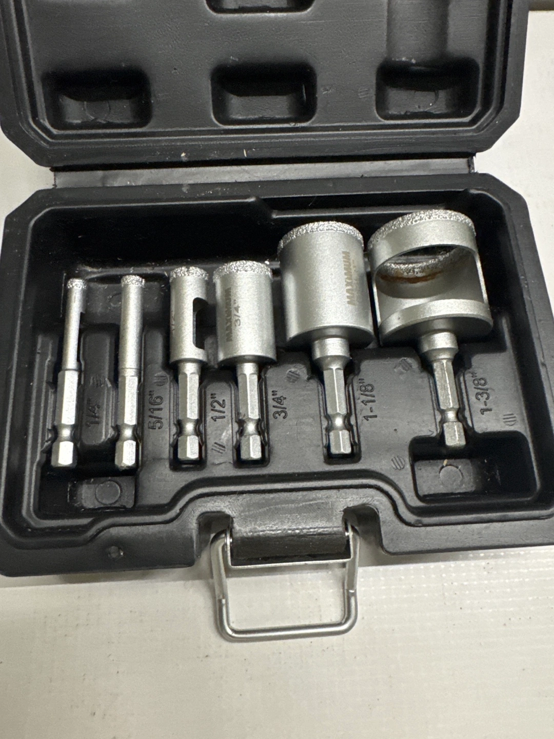 Selling a Maximum diamond hole saw kit. It comes in its original box and includes multiple sizes: 1/4", 5/16", 1/2", 3/4", 1-1/8", and 1-3/8". Great for various projects around the house! May have used it once
