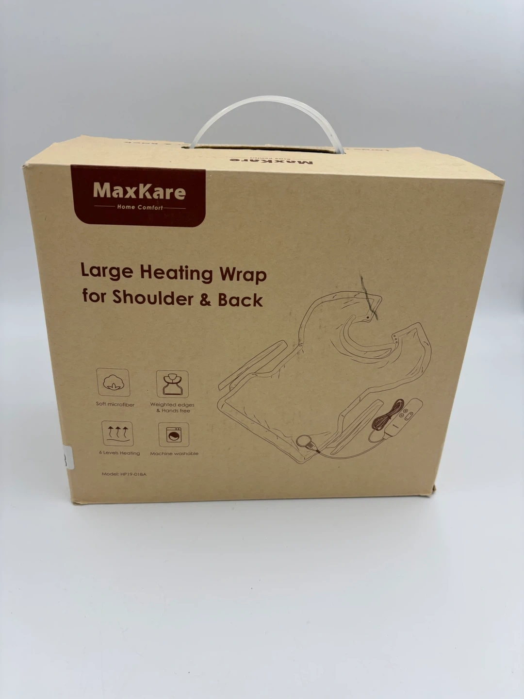 Selling a brand new MaxKare Large Heating Wrap for Shoulder & Back! This is perfect for those chilly evenings or for soothing sore muscles. It comes in its original box and includes the user manual. - Soft microfiber material - Weighted edges - Hands-free design - 6 levels of heating - Machine washable Model: HP19-018A