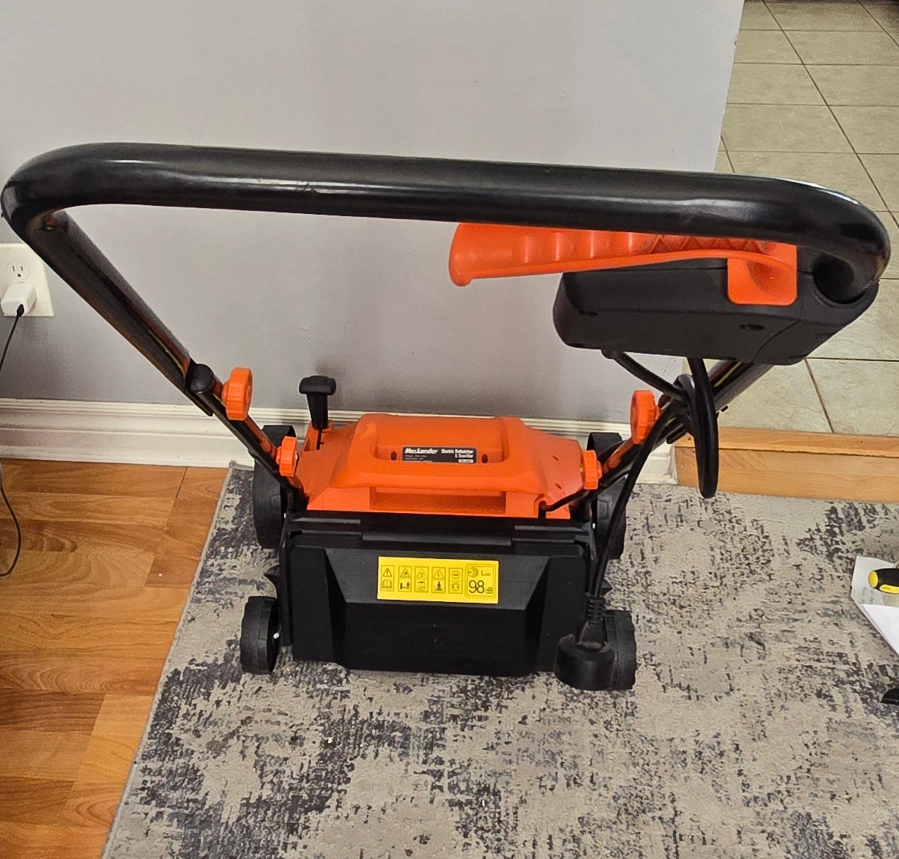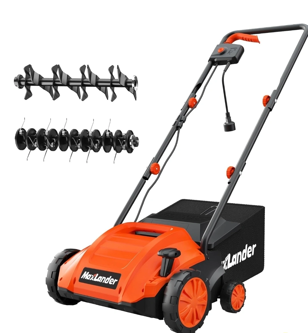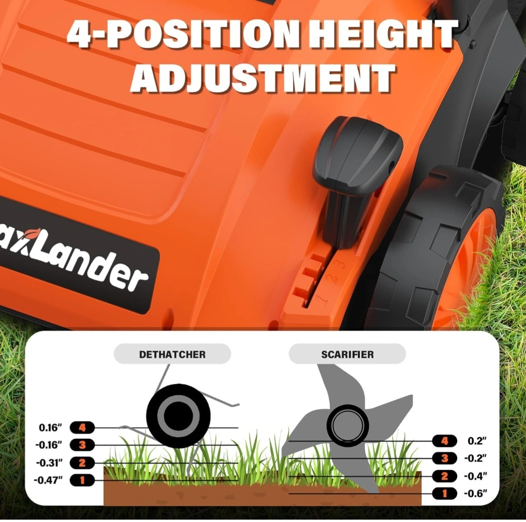 Power source: Corded Electric Colour : Orange 🟧 Style:13-Inch Dethatcher and Scarifier Material: Plastic Item weight: 9.2 kg 🚫Removable Collection Bag NO INCLUDED. POWERFUL PERFORMANCE: MAXLANDER electric dethatcher featured with 12Amp powerful copper motor providing up to 3,000RPM speed, rakes a 13" wide path to get your job done faster and more efficiently. 2-IN-1 MULTIPURPOSE: The lawn dethatcher comes with a dethatching blade to remove thick layers of dead plants of your lawn, and a scarifying blade to cut grass roots for thicker and healthier lawn growth. 4-POSITION HEIGHT ADJUSTMENT: Through the scarifier's control lever selects depth. Scarifying blade: -0.6" to 0.2" adjustable; Dethatching blade: -0.47" to 0.16" adjustable, to meet the daily maintenance needs of all types of lawns. 📍Pick it up Niagara Falls.
