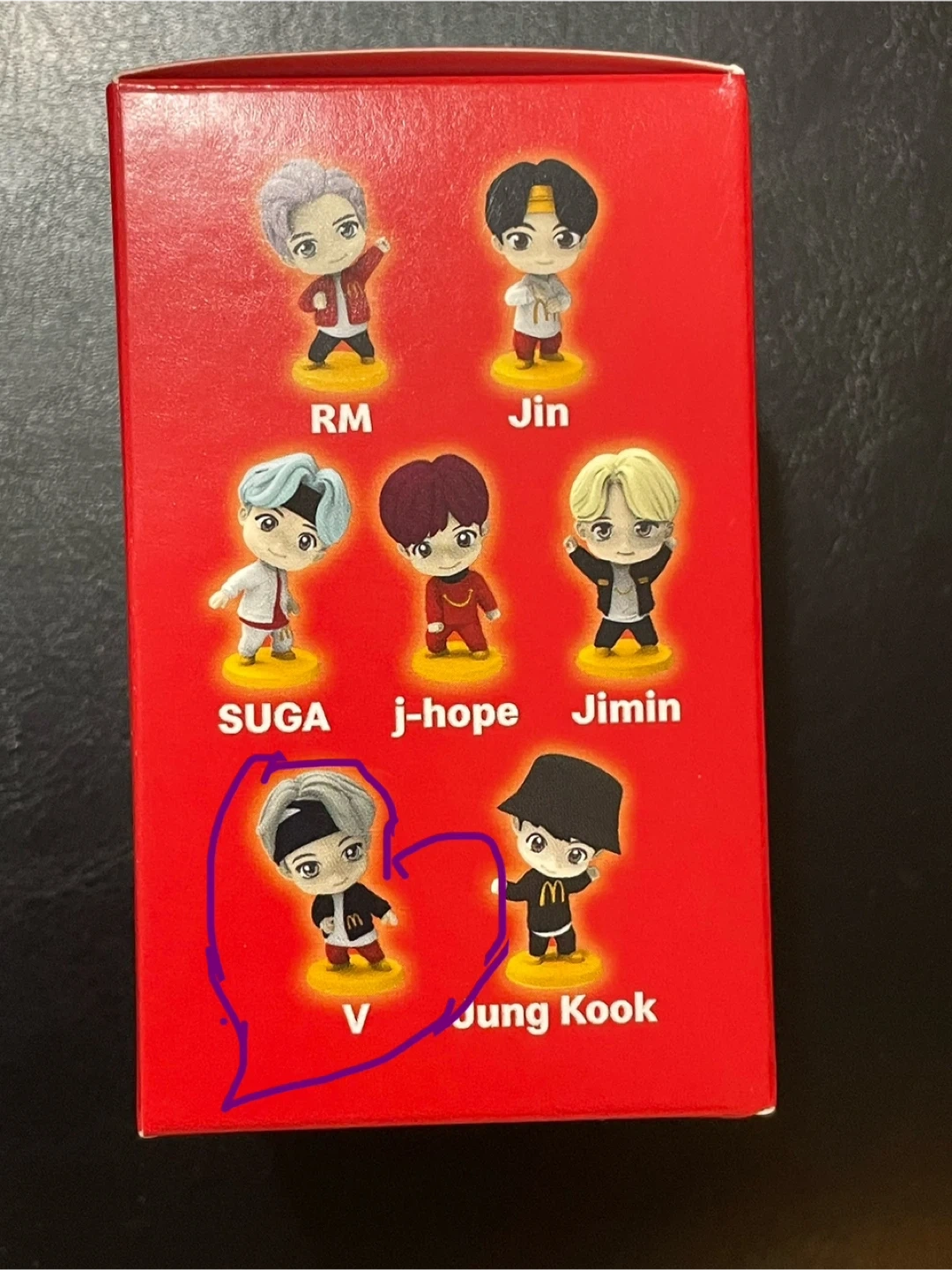 Selling a brand new, in box McDonald's BTS TinyTAN figure of V! It's never been opened except for taking photo of it) and is in perfect condition. Great for any BTS or TinyTAN fan! Will sell @ $8 OBO or will trade for Encore Edition (Red Box) : #9 (Jin), #11 (J-Hope) or #12 (Jimin).