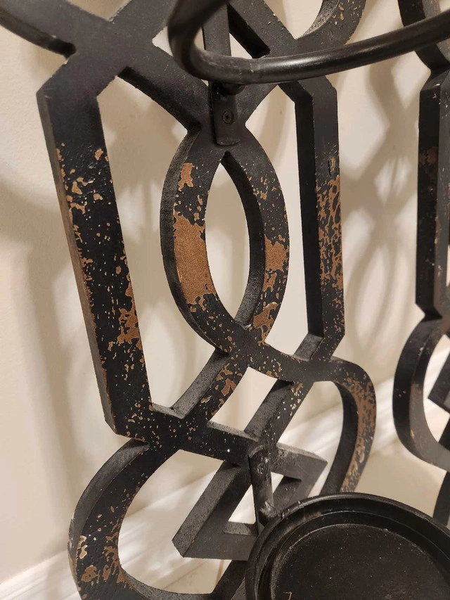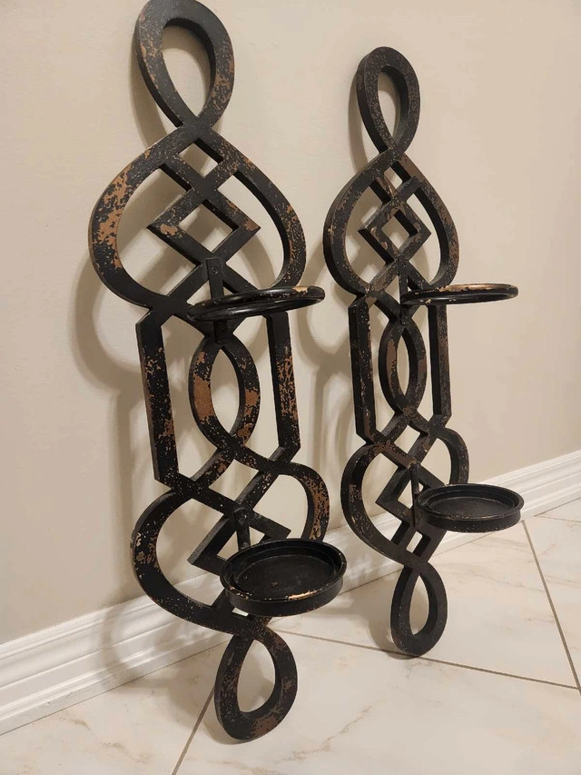 Stunning large, black distressed wall scones. 31" x 9.5" Hang as is, use as plant holders, or add a couple tall flameless candles for warmth and style. Only $20 each for these beauties!