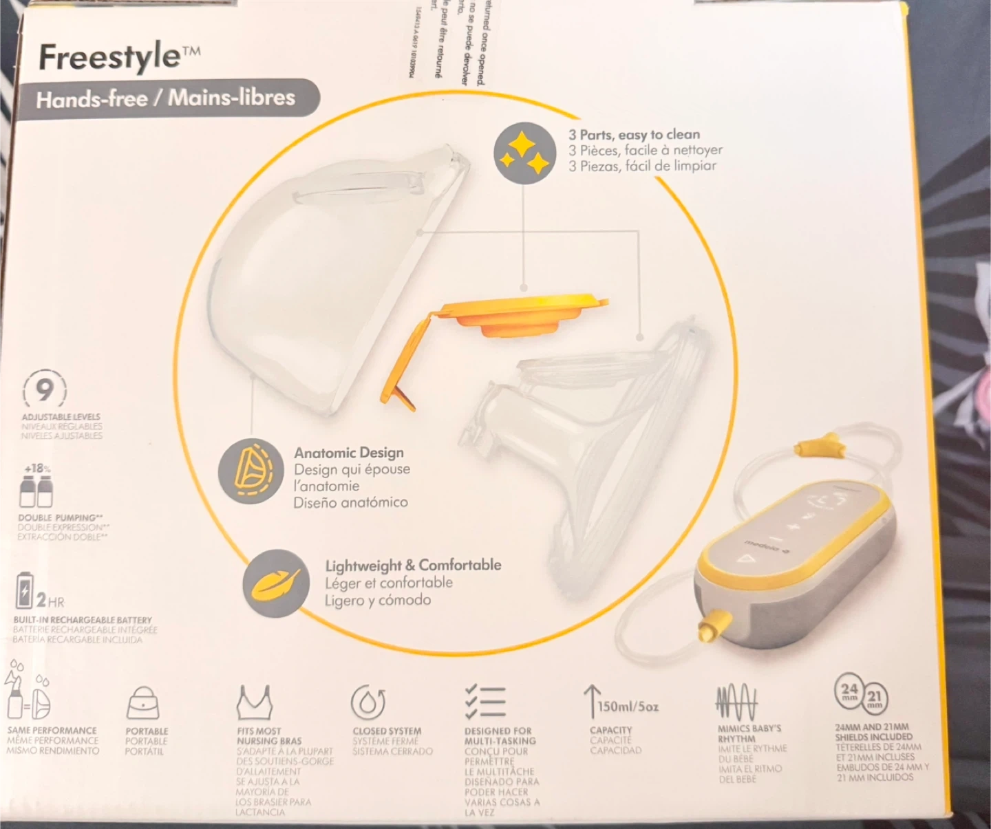 Selling a Medela Freestyle double electric breast pump! It's designed for hands-free use and is lightweight and comfortable. The pump has 9 adjustable levels and is easy to clean. It comes with multiple parts and a clip-on lanyard. It also includes 24mm and 21mm shields. Brand New& Never Used