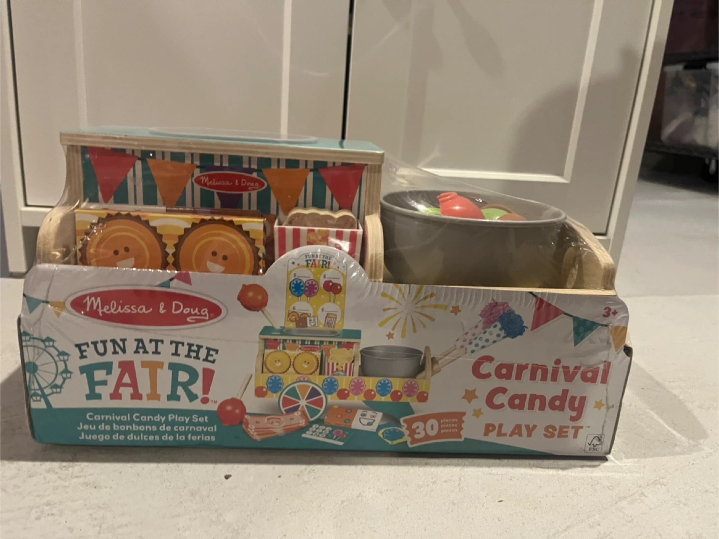 I'm selling a brand new Melissa & Doug Carnival Candy Play Set! It's still in its original packaging and contains 30 pieces. Perfect for kids aged 3+