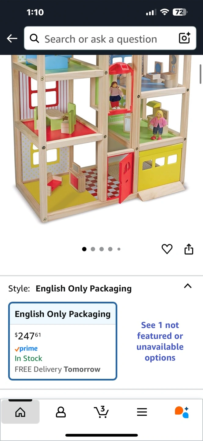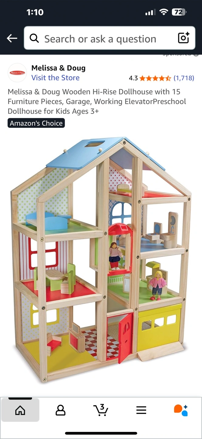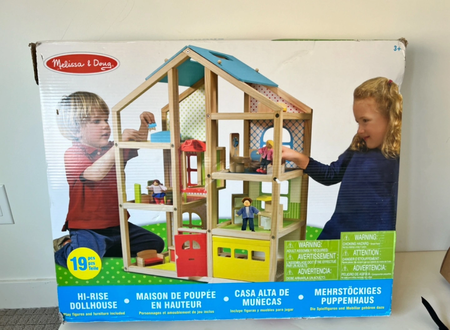 Selling a Melissa & Doug Hi-Rise Dollhouse, great for kids ages 3+. It comes with 15 furniture pieces, a garage, and a working elevator! The dollhouse is in new with the original box.