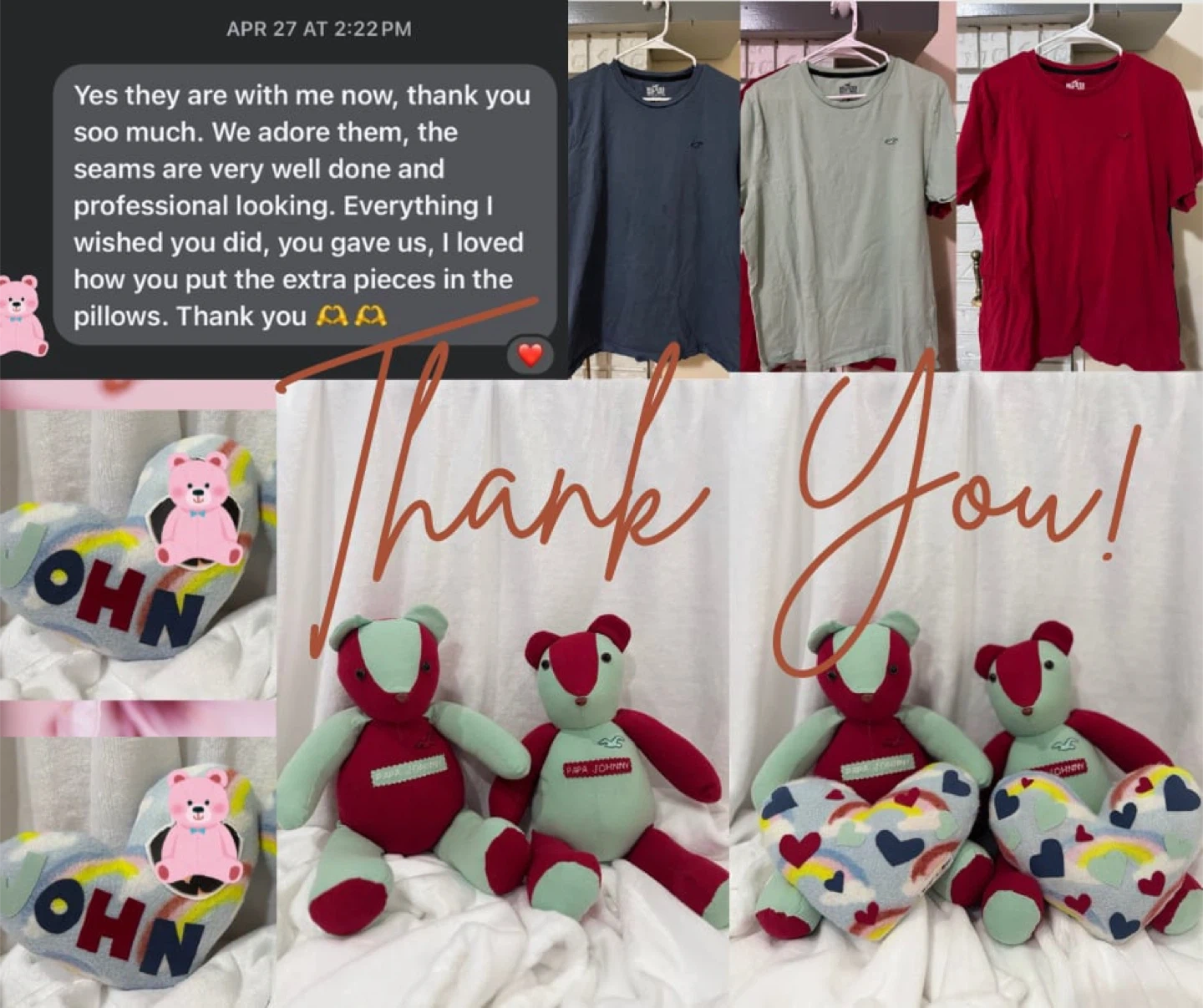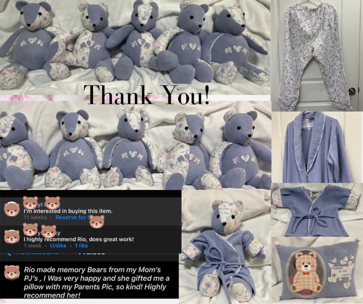💖 Hold Your Memories Close 💖 Life moves fast, but memories can last forever. I turn your loved ones’ clothing into handcrafted Memory Bears — a hug you can keep anytime. Whether it’s a baby’s first outfit, a favorite shirt, or something from someone special, every bear is made with love and care, keeping your memories alive. 🧸✨ 📩 Message me today to create your one-of-a-kind keepsake.