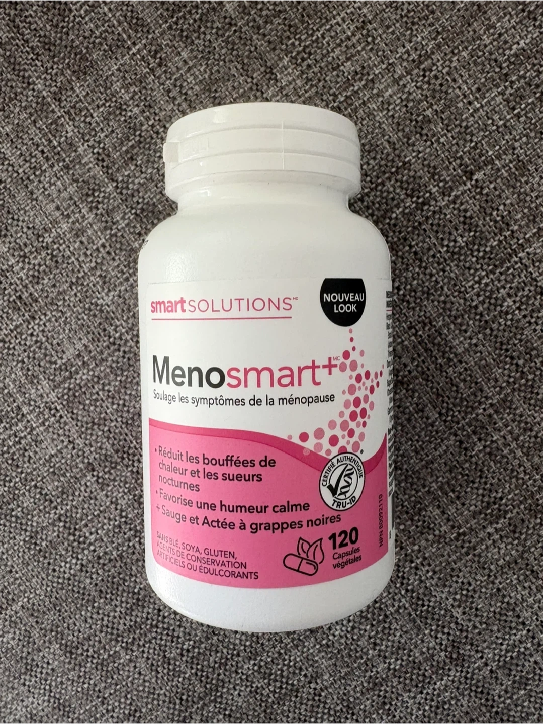 I'm selling a bottle of MenoSmart+ by Smart Solutions. This supplement helps relieve menopause symptoms and contains 120 capsules. It includes ingredients like Hesperidin, Black Cohosh Extract, and Sage. It's proudly Canadian, and the expiration date is 2027 October Nepean