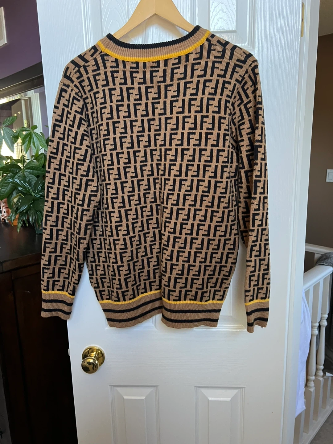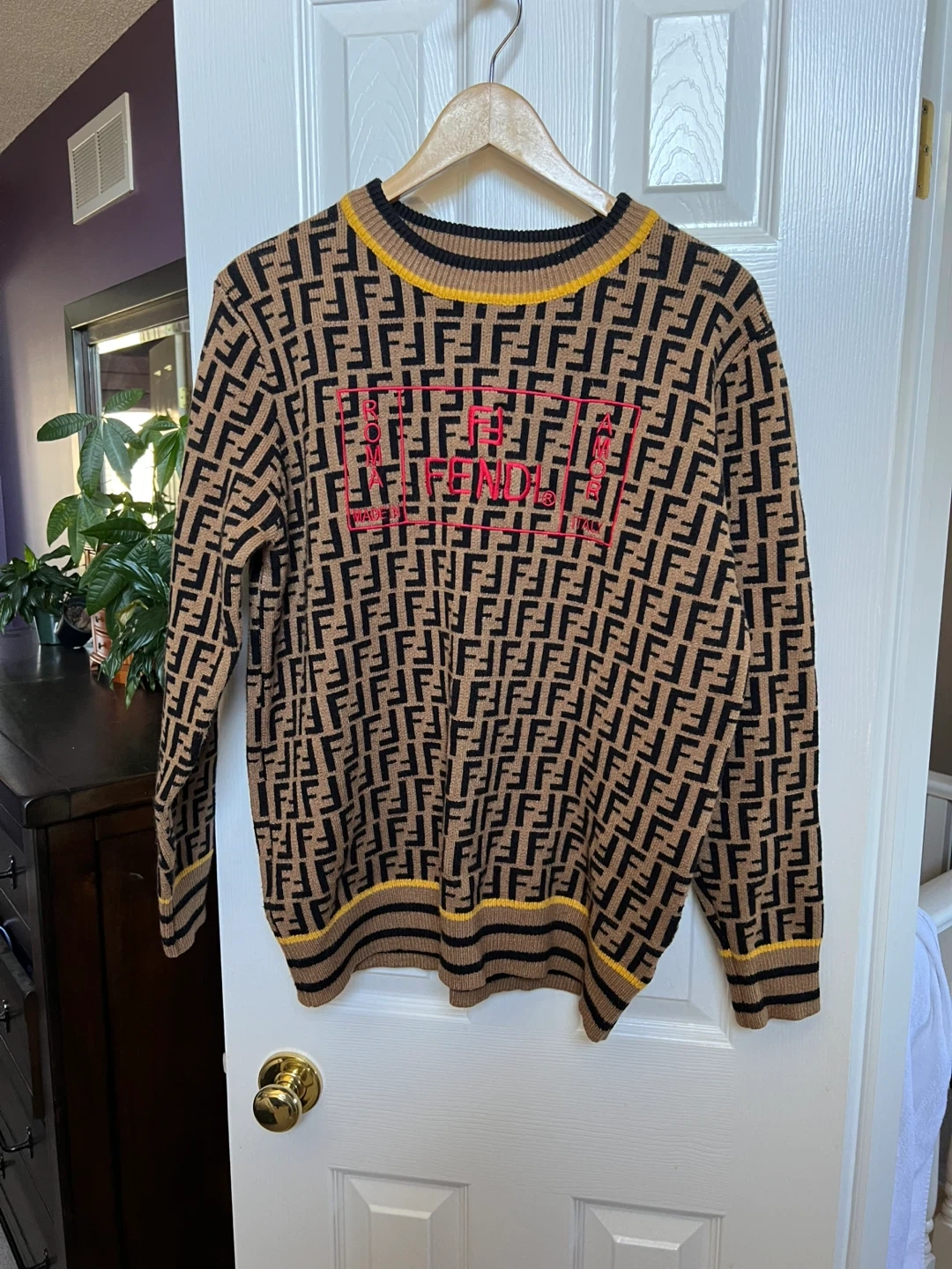 Selling a Fendi Roma Amor sweater. It features the iconic Fendi logo pattern throughout the design. The sweater has a tan base with black and yellow accents, and a pink Fendi logo embroidered on the front. It's a stylish piece to add to your wardrobe!
