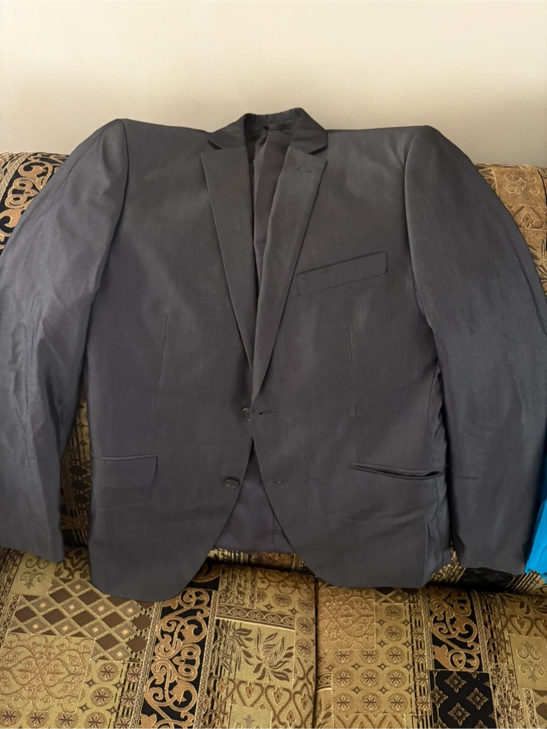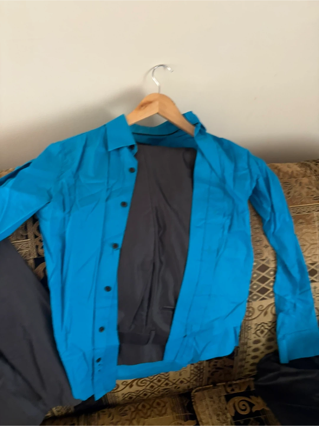 Selling a men's suit jacket and blue dress shirt with pants. The jacket is a stylish grey, and the pants are black. Both are in good condition and ready to wear!