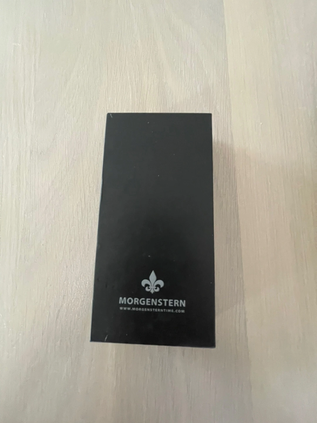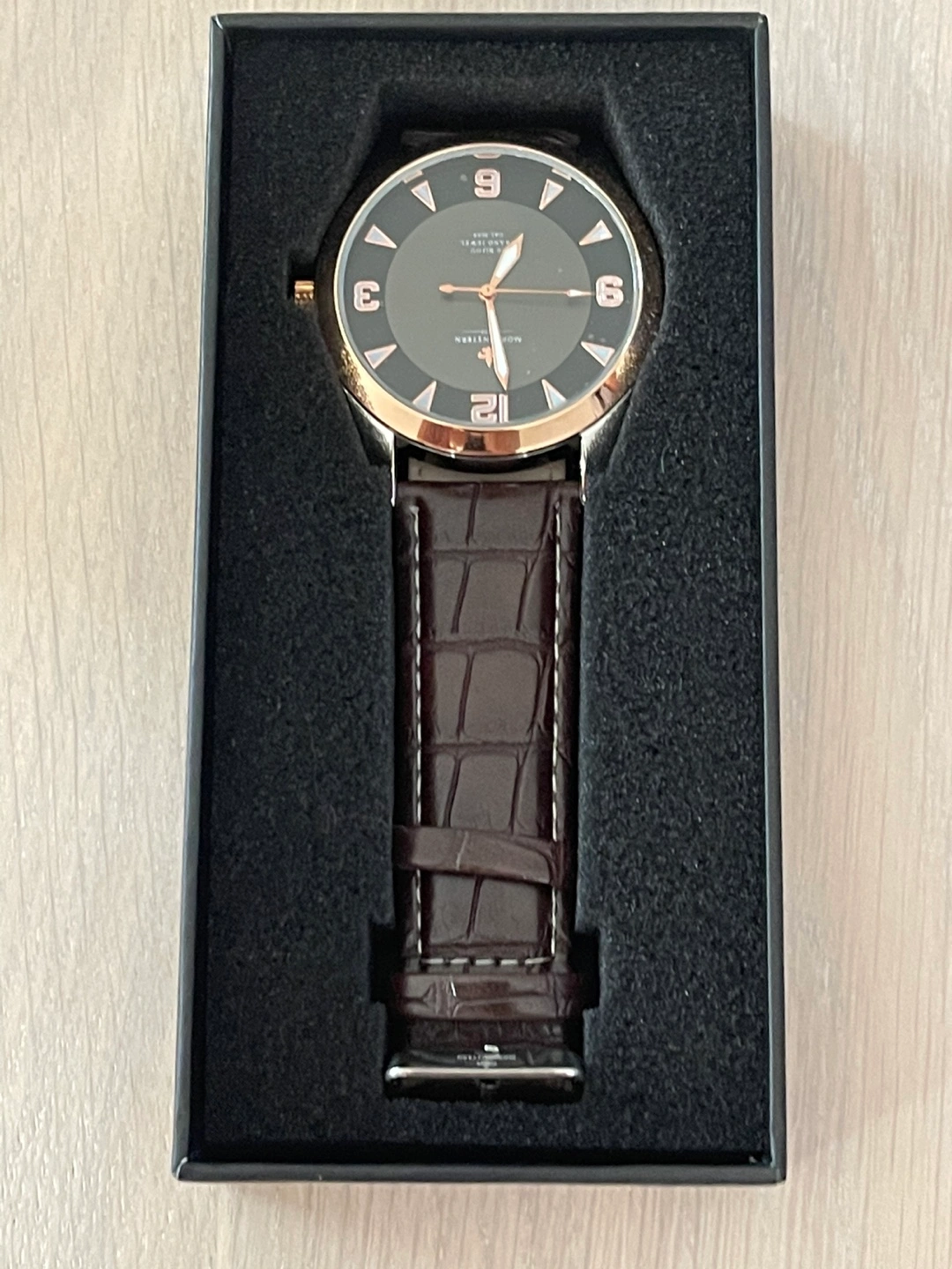 Classic men's wristwatch. Black face, rose gold accents. Brown leather band. Comes in original box.