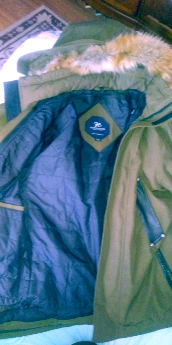 Olive green men's winter jacket. Size small. Features a faux fur lined hood. Warm and comfortable.