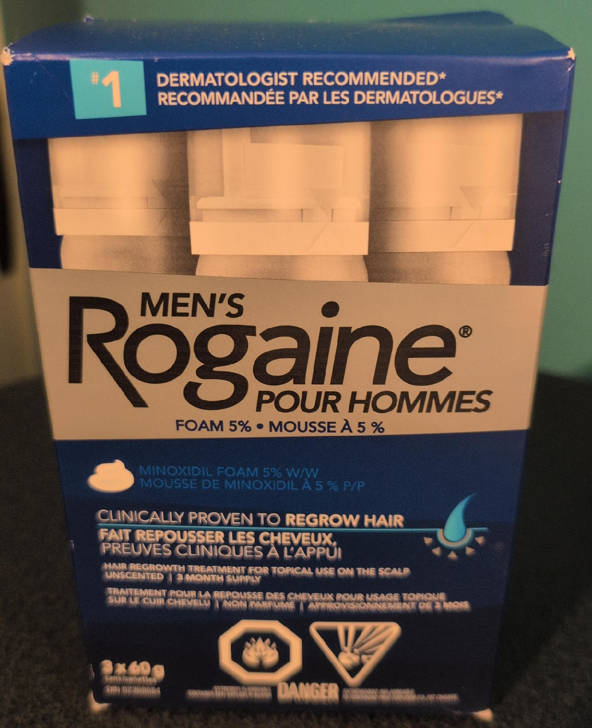 Selling a 3-month supply of Men's Rogaine Foam 5%. This foam is clinically proven to help regrow hair. It contains 5% minoxidil and is for topical use on the scalp. Expiry date is 2025 September 09