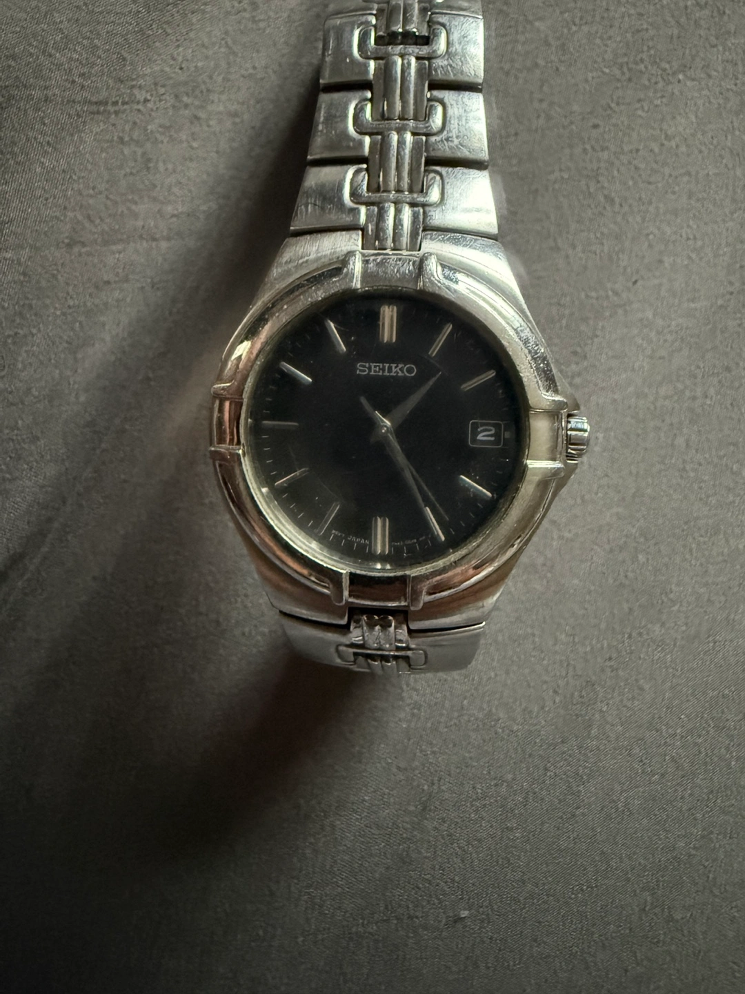 Selling a men’s Seiko watch. It's in good condition. The watch features a silver-tone stainless steel band and a black dial. It's a stylish and reliable timepiece! Just needs battery Selling for 45.00