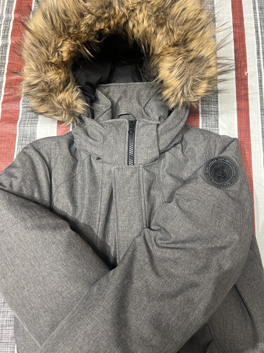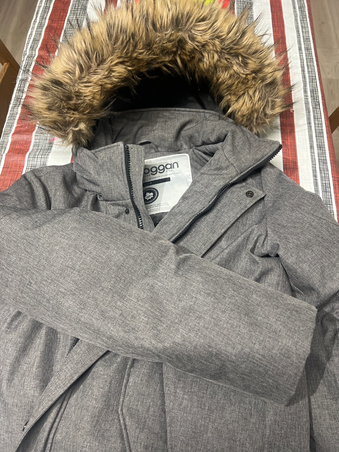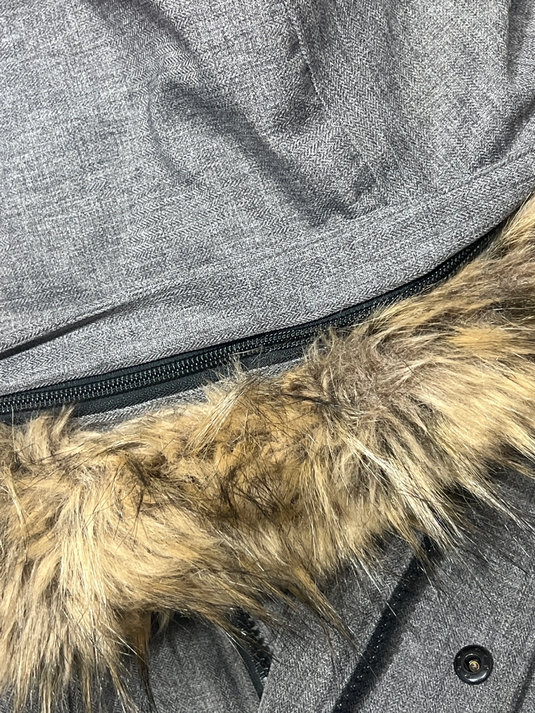 Men's grey winter heavyweight parka. Features a removable faux fur-trimmed hood and zipper closure. Inside & outside pockets. Suitable for very low temperatures. Size Large.