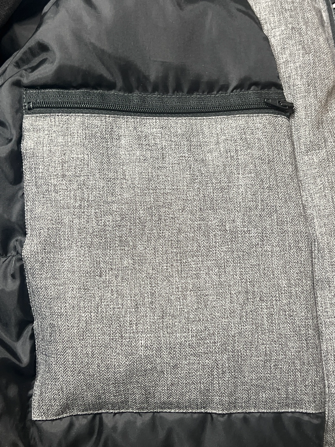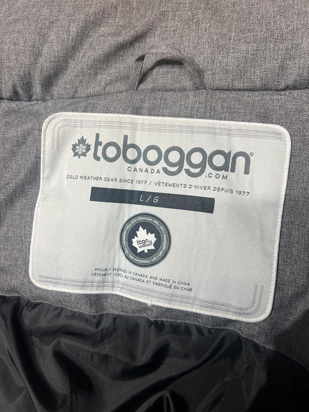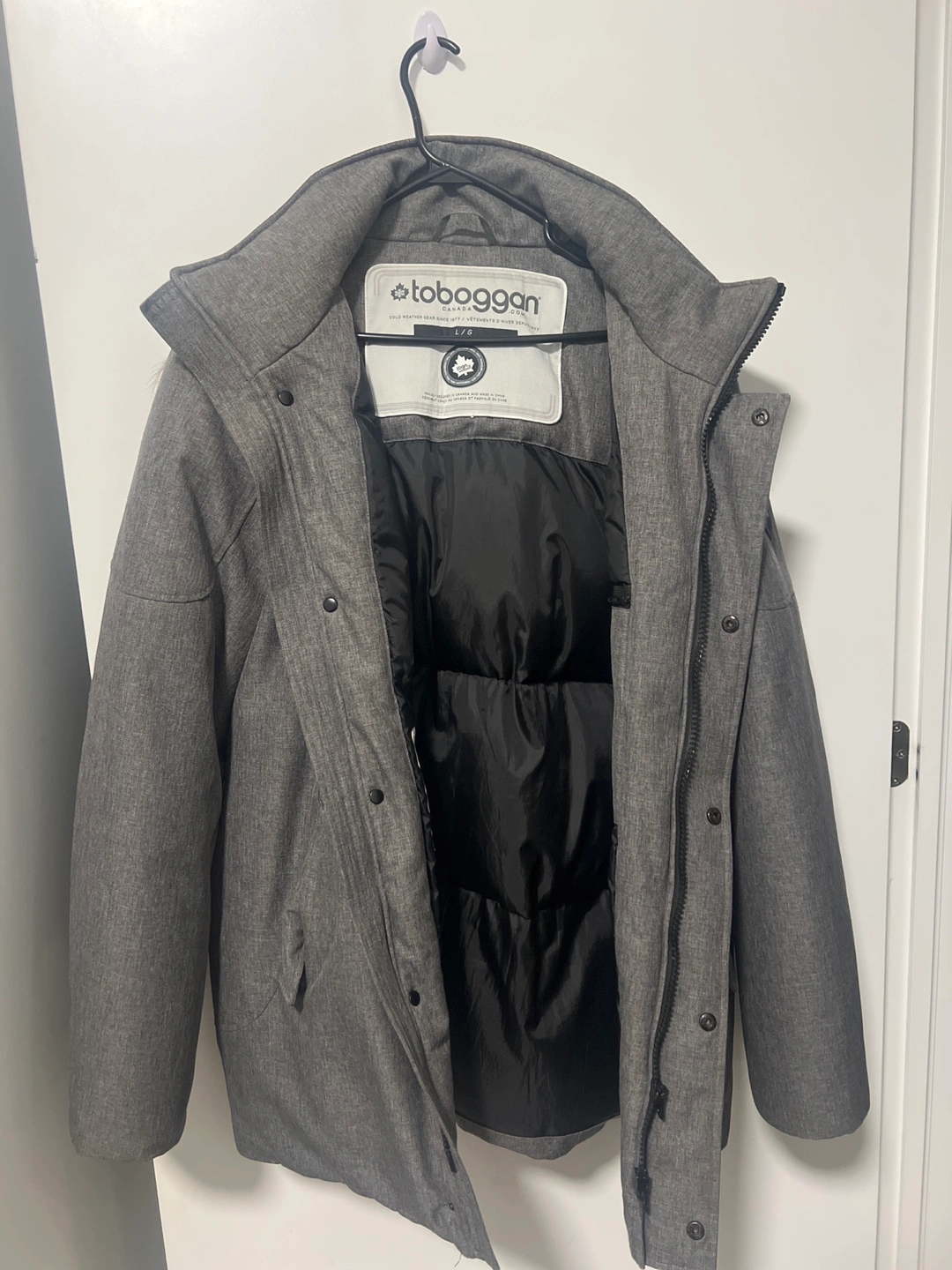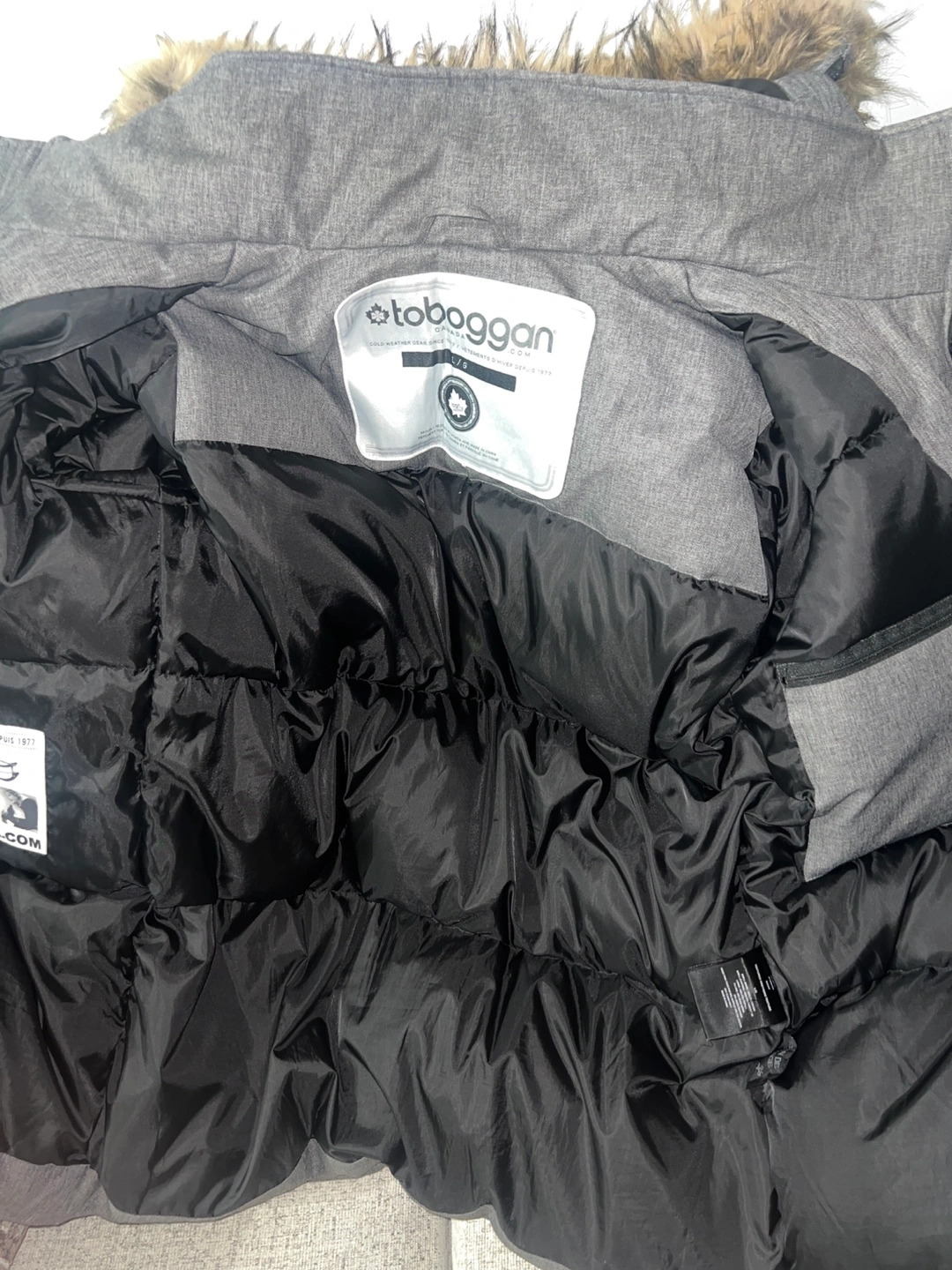 Men's grey winter heavyweight parka. Features a removable faux fur-trimmed hood and zipper closure. Inside & outside pockets. Suitable for very low temperatures. Size Large.