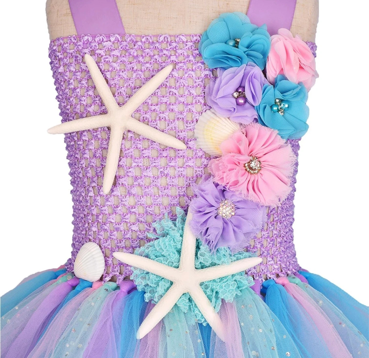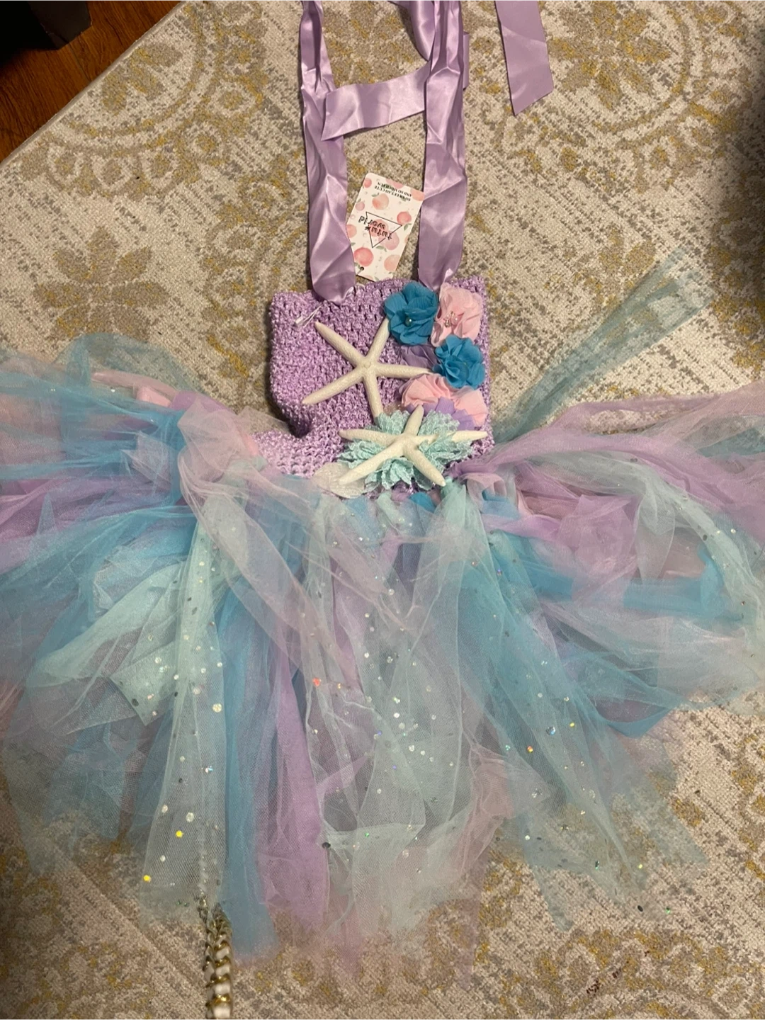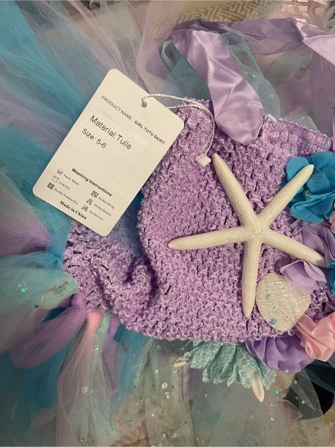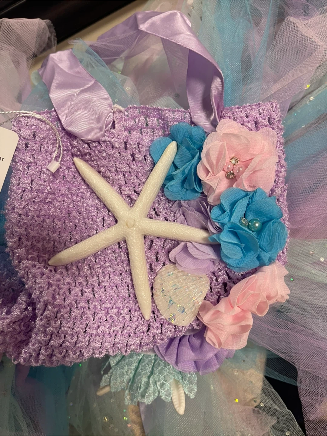 This adorable mermaid tutu dress is perfect for your little one! It features a beautiful blend of pastel colours, including purple, pink, and blue. The dress is decorated with starfish and flower accents. It's size 5-6