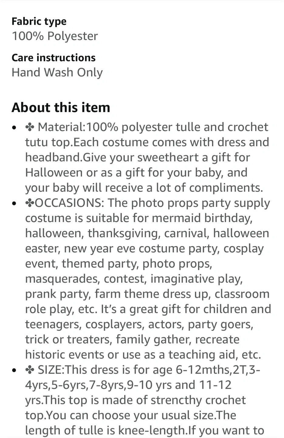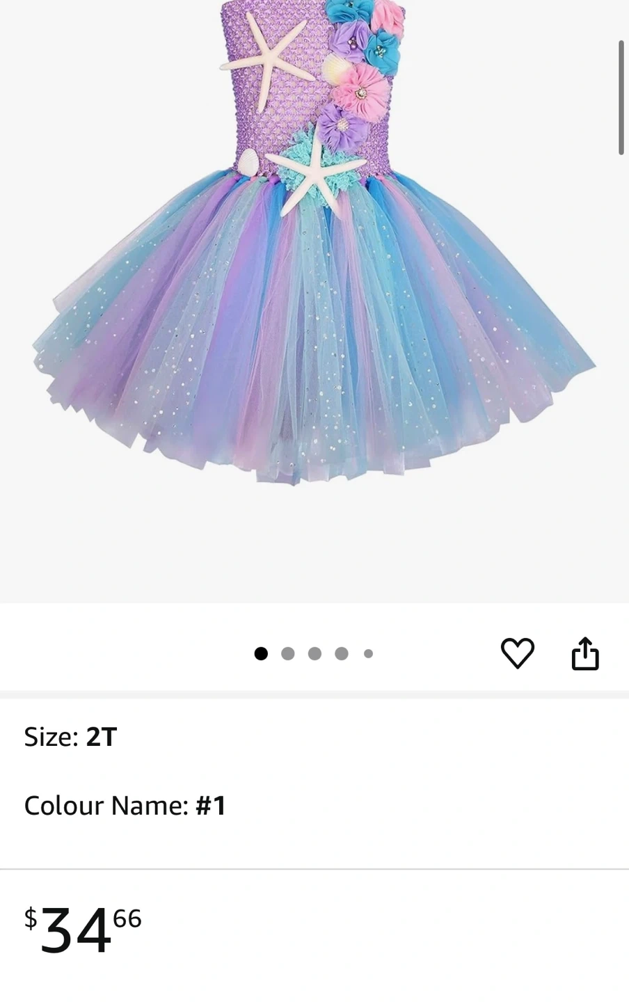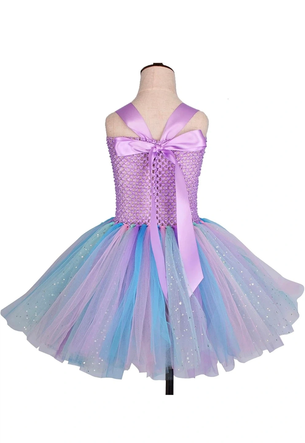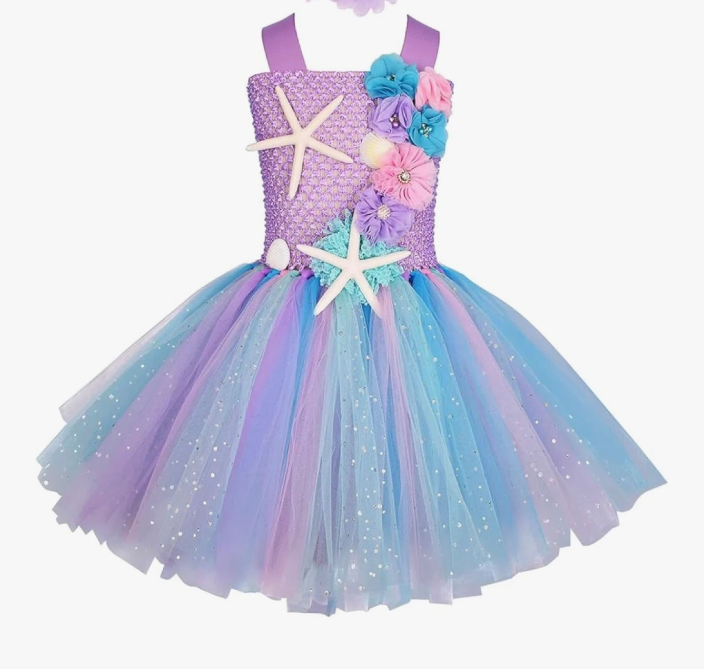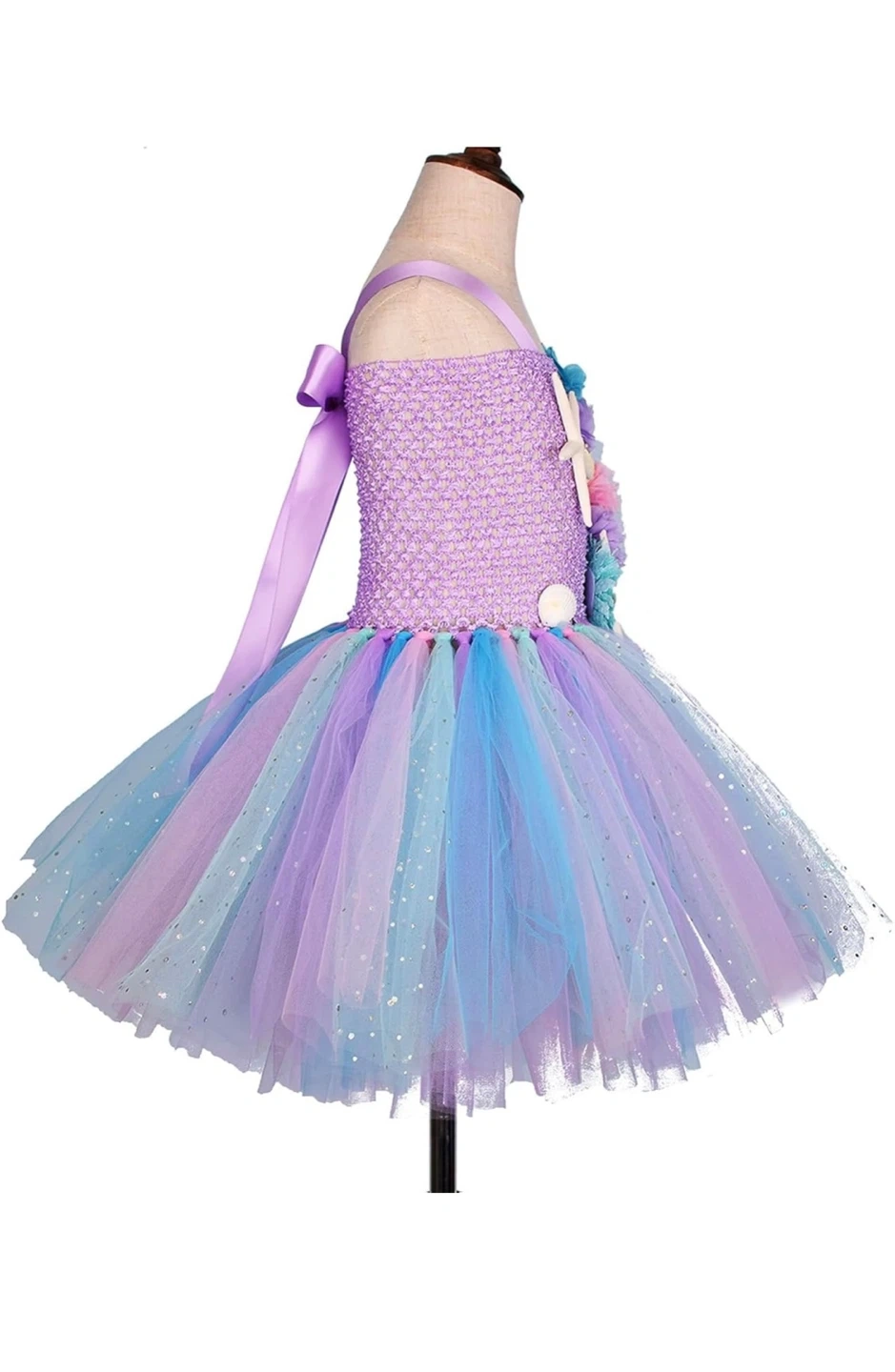 This adorable mermaid tutu dress is perfect for your little one! It features a beautiful blend of pastel colours, including purple, pink, and blue. The dress is decorated with starfish and flower accents. It's size 5-6