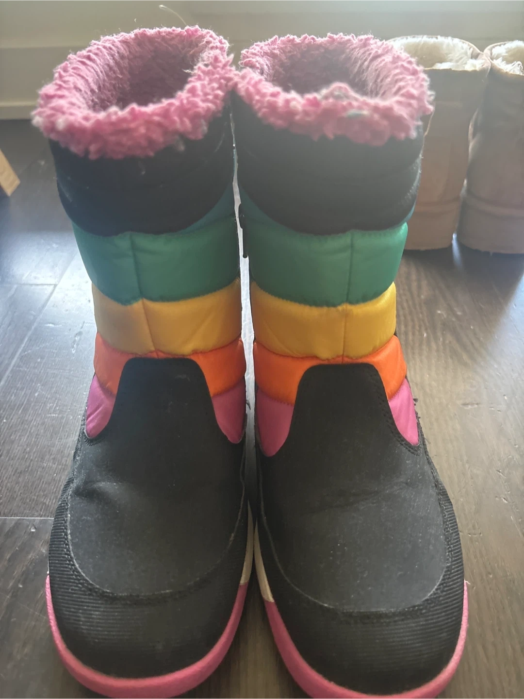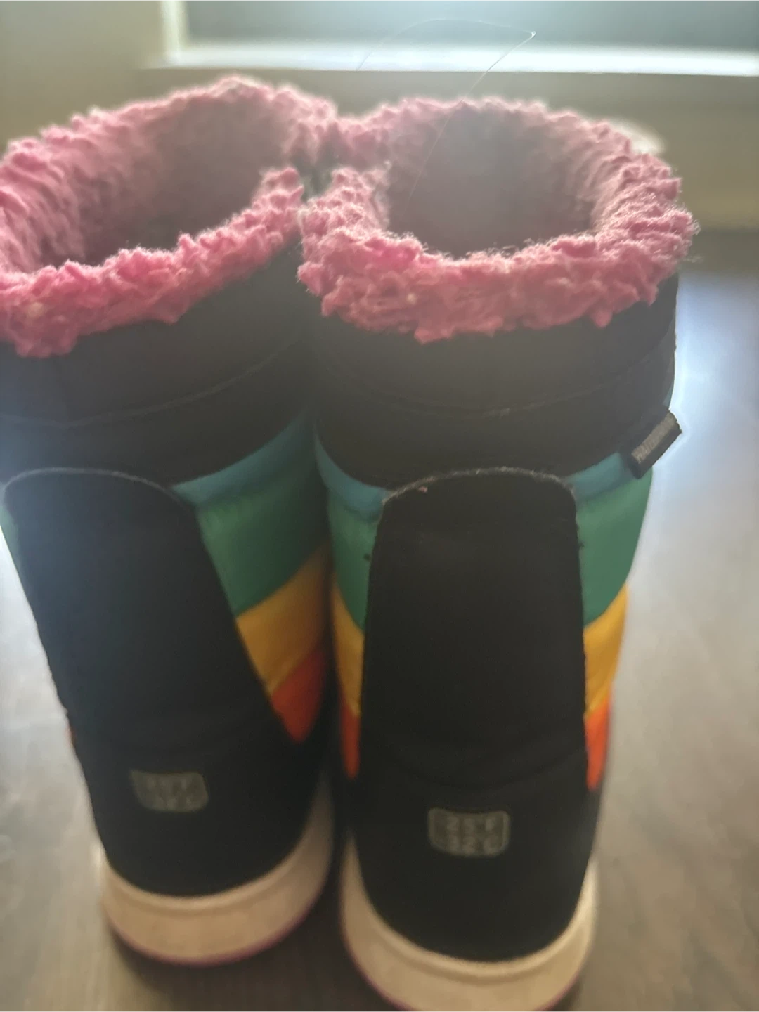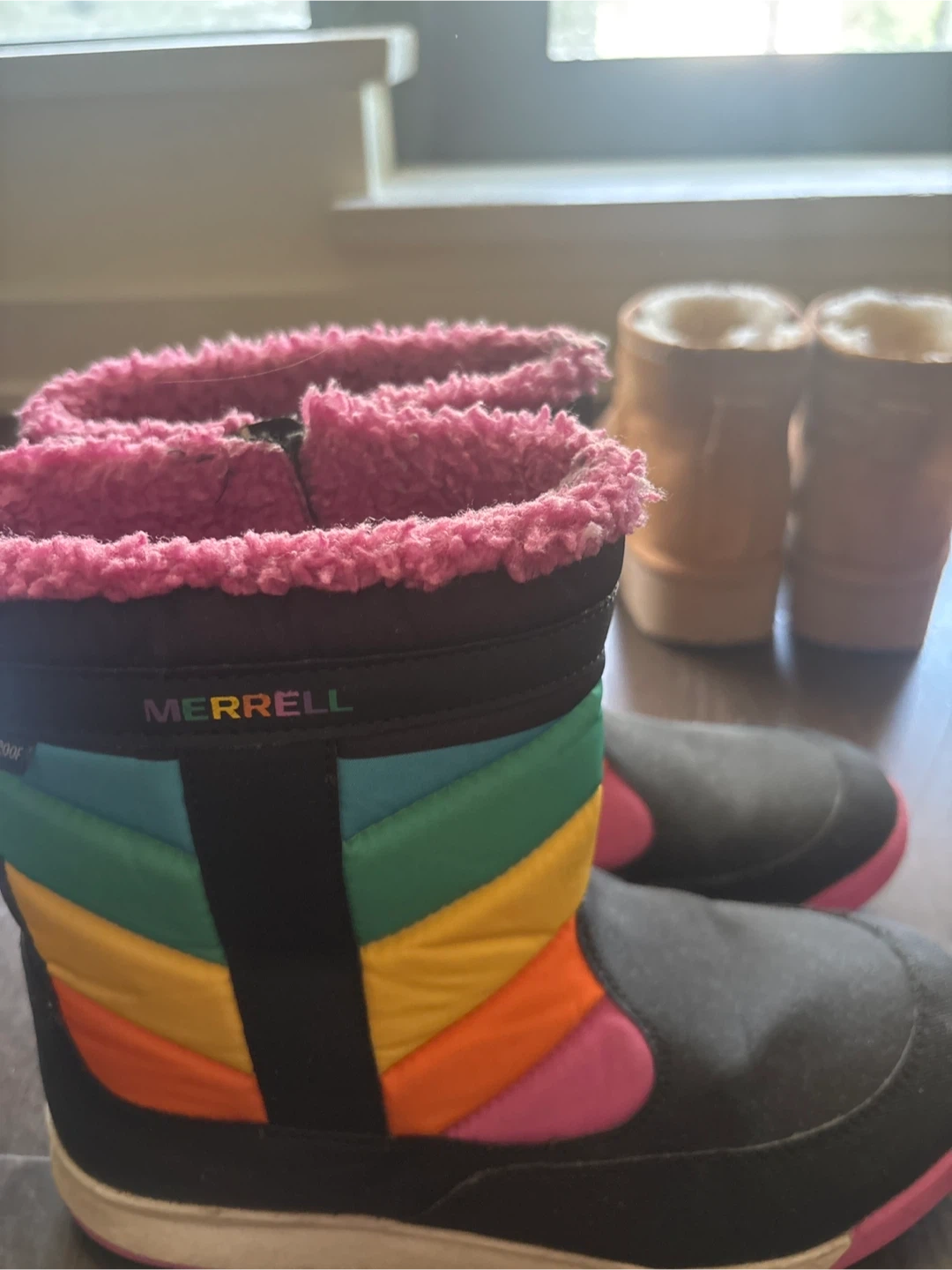 Keep your little one warm and stylish with these adorable Merrell winter boots! They feature a fun rainbow design and cozy pink lining. Size 12.