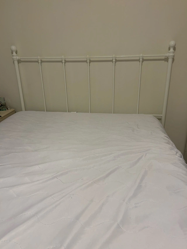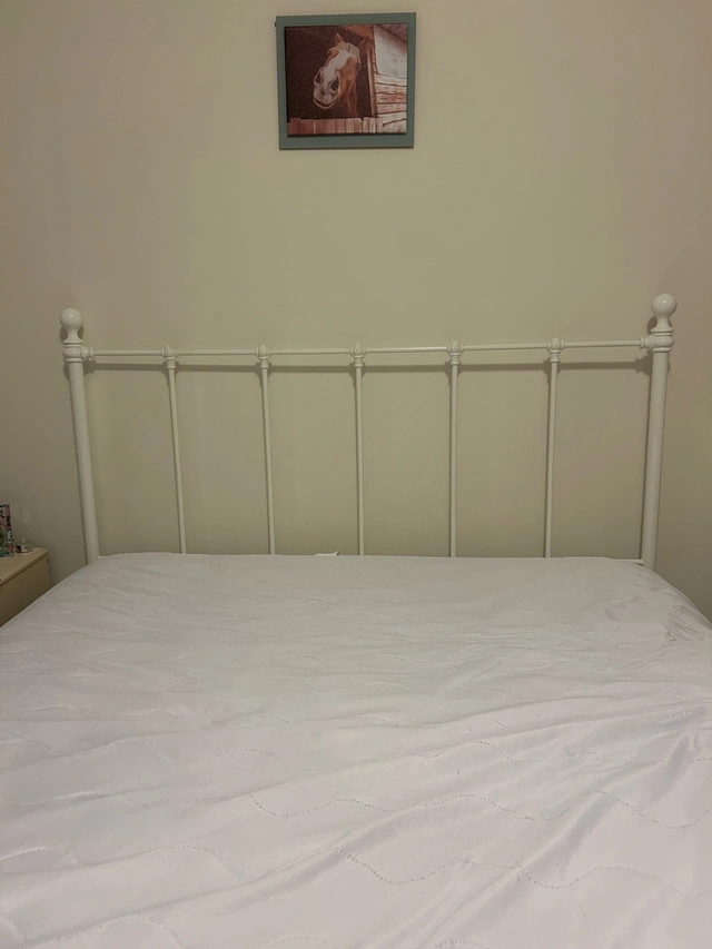 I'm selling a white metal bed frame, perfect for adding a touch of elegance to any bedroom. This frame is sturdy and reliable, ready to support your mattress and provide a good night's sleep. As it's in used condition, it has some signs of wear, but it remains fully functional and aesthetically pleasing. Here are the specs: * Colour: White * Material: Metal * Size: Suitable for a double bed If the ad is still up, the bed frame is still available.
