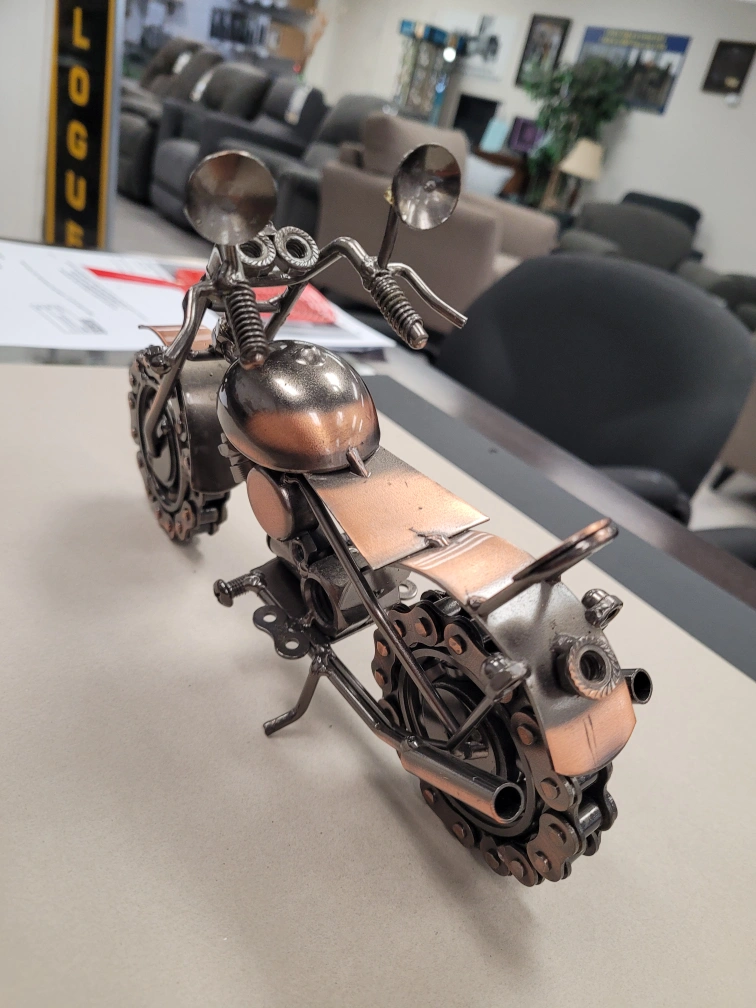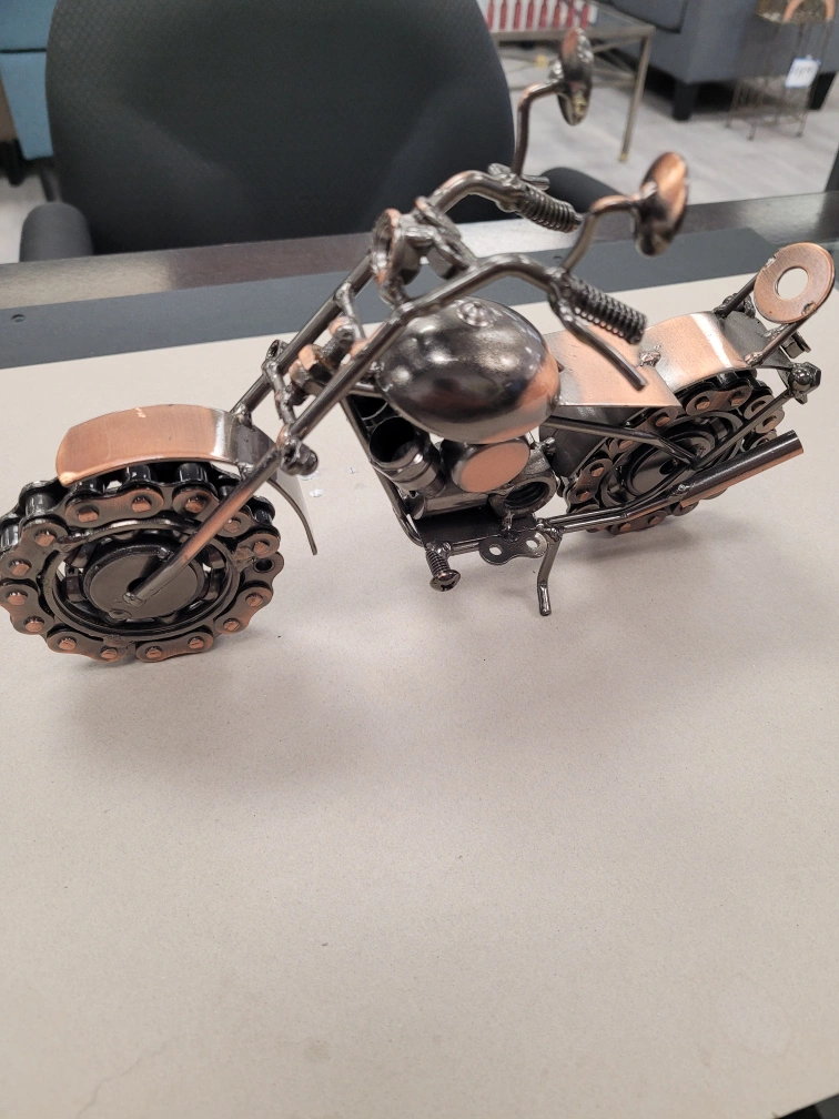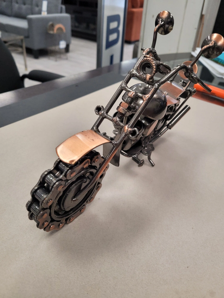 Cool metal motorcycle sculpture! It's a unique decorative piece, perfect for adding some personality to your space. The details are really neat, with a mix of copper and dark metal tones. It's in great shape and ready for a new home!