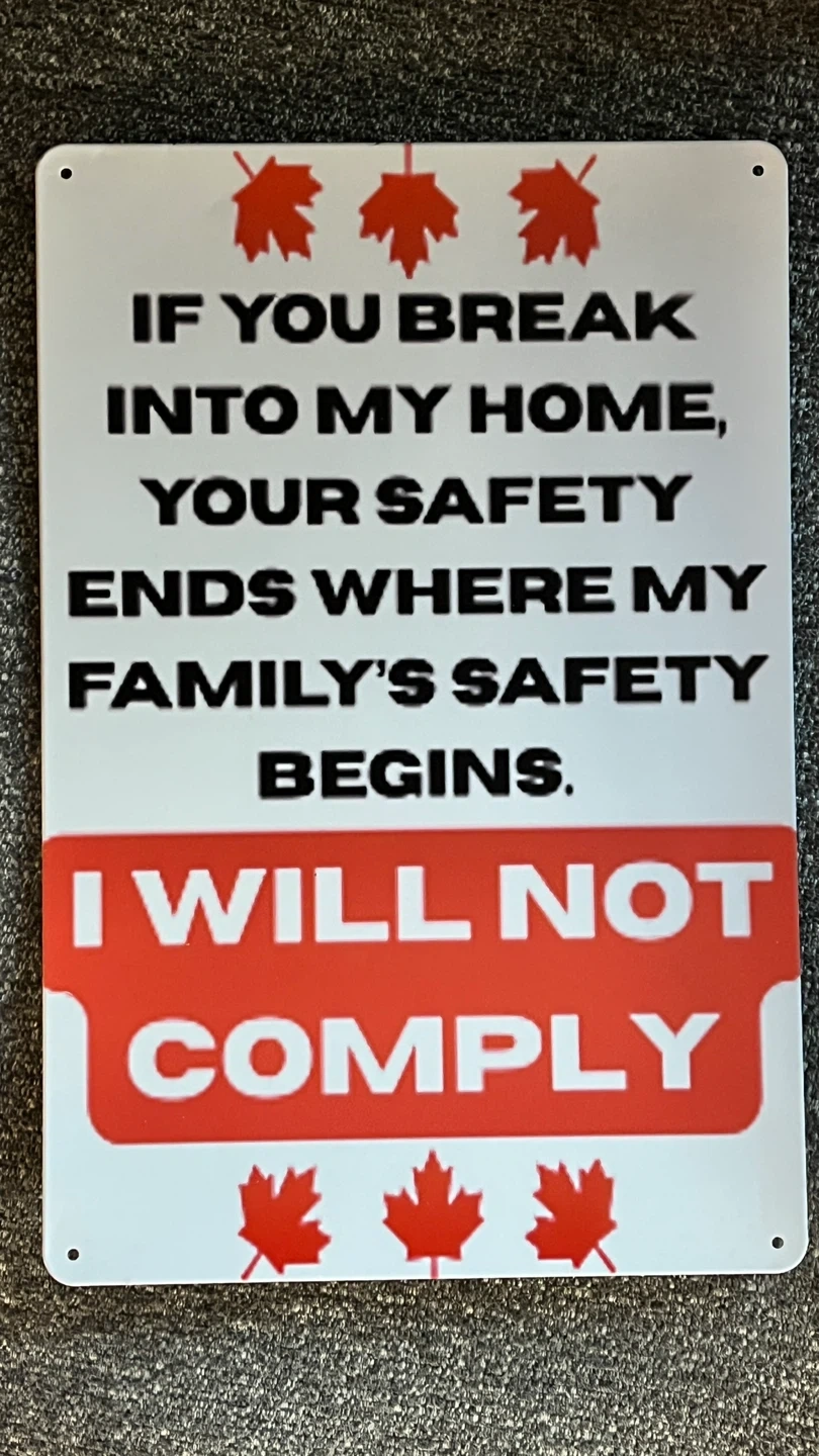 Metal sign with a message about home safety. Features maple leaf designs and bold text. Sign measures 8 x 12.