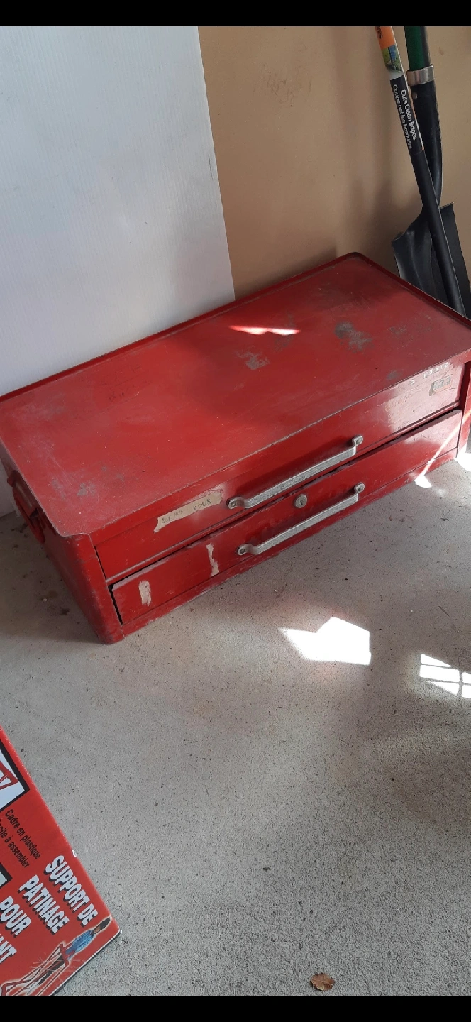 A red metal tool box with two drawers. It shows signs of wear and use, but still has lots of life left in it