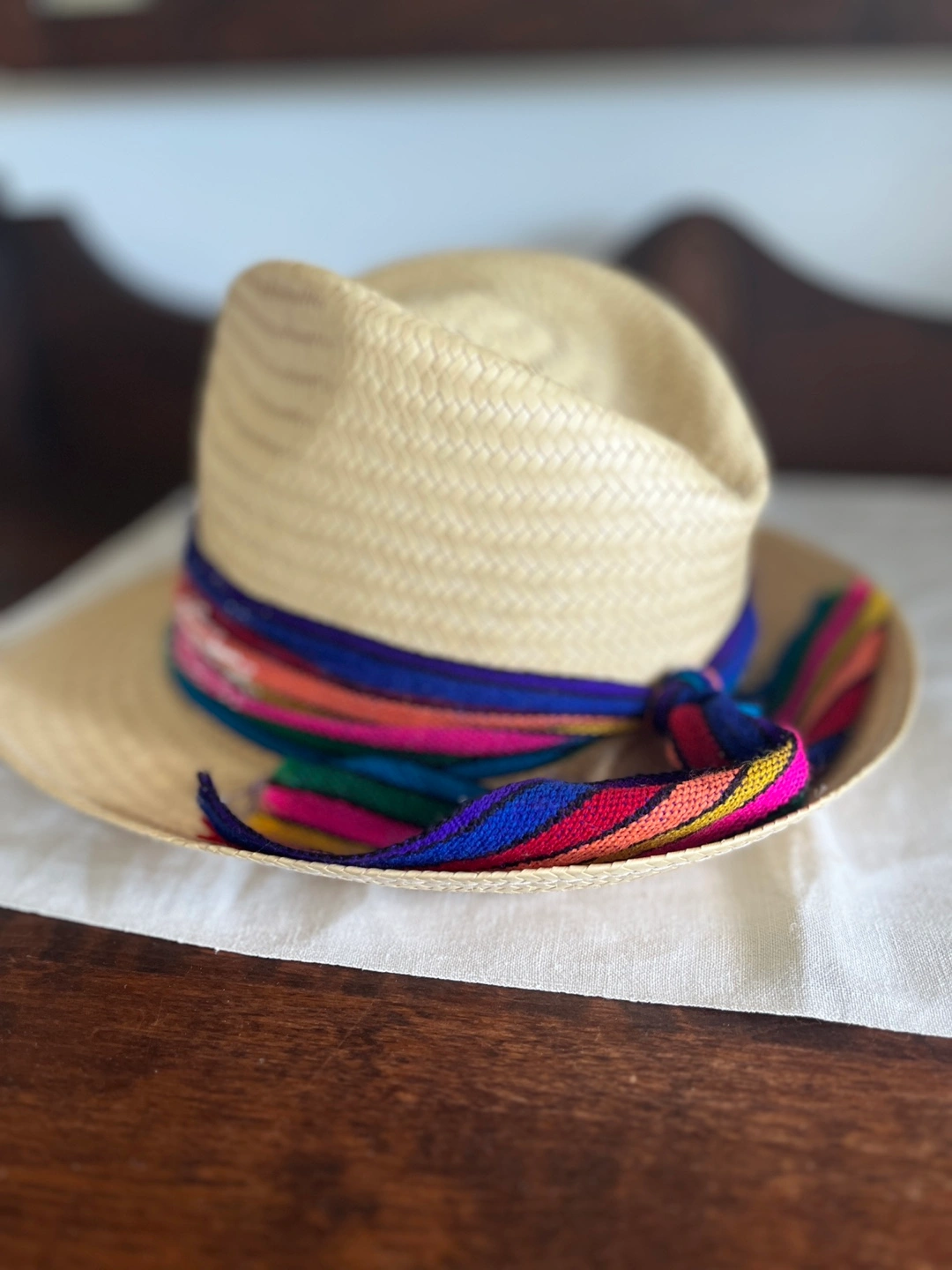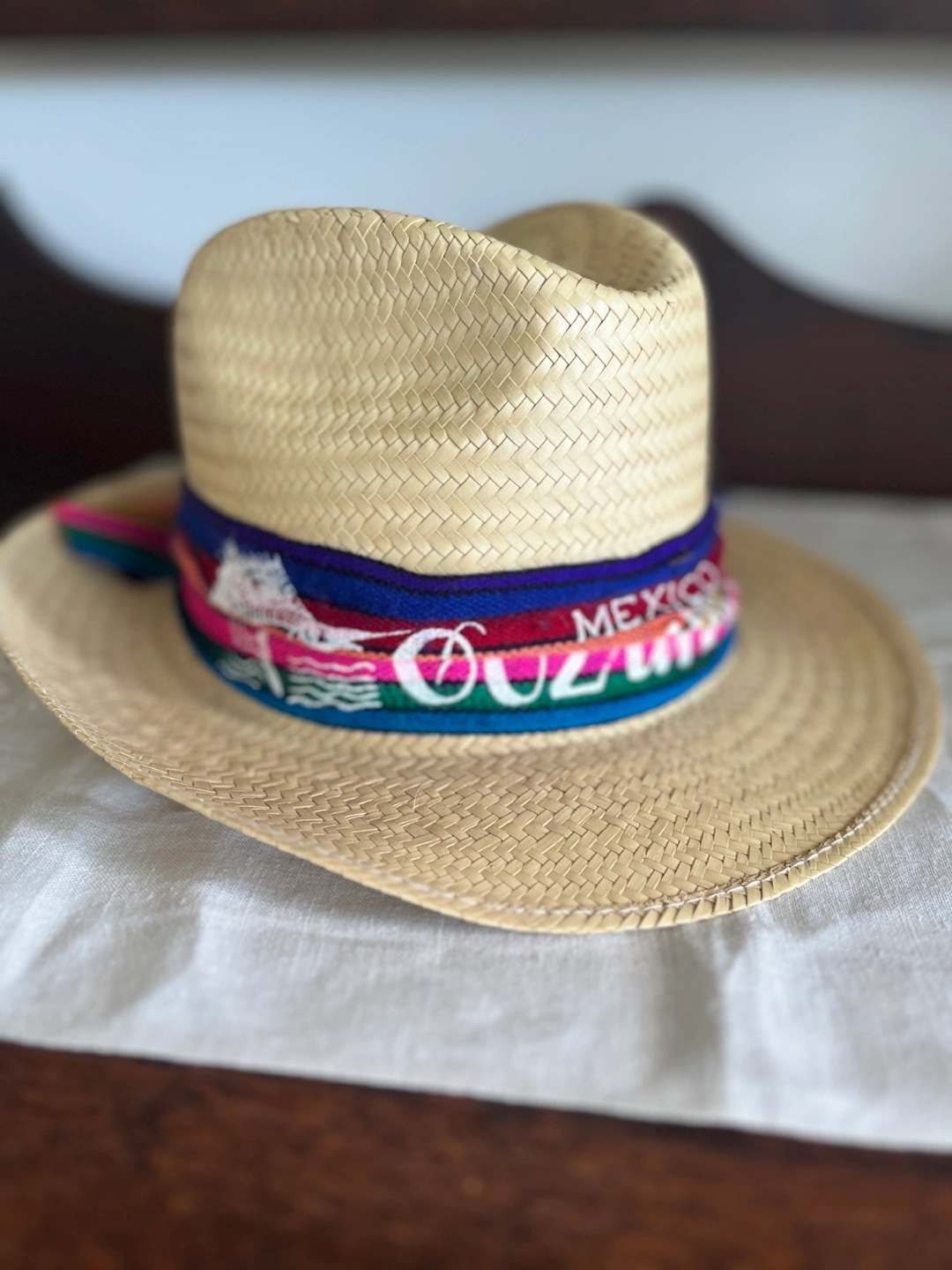 Selling a woven straw hat with a colourful band that says 'Mexico Cozumel' on it. It's in great condition and perfect for summer! Pick up: Steveston North