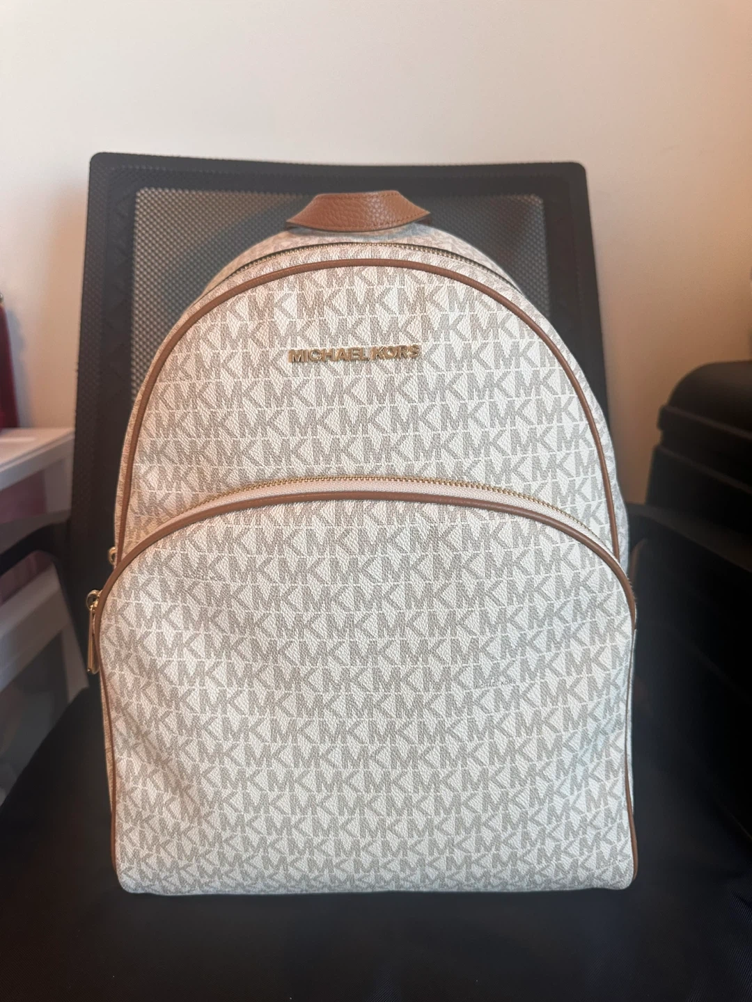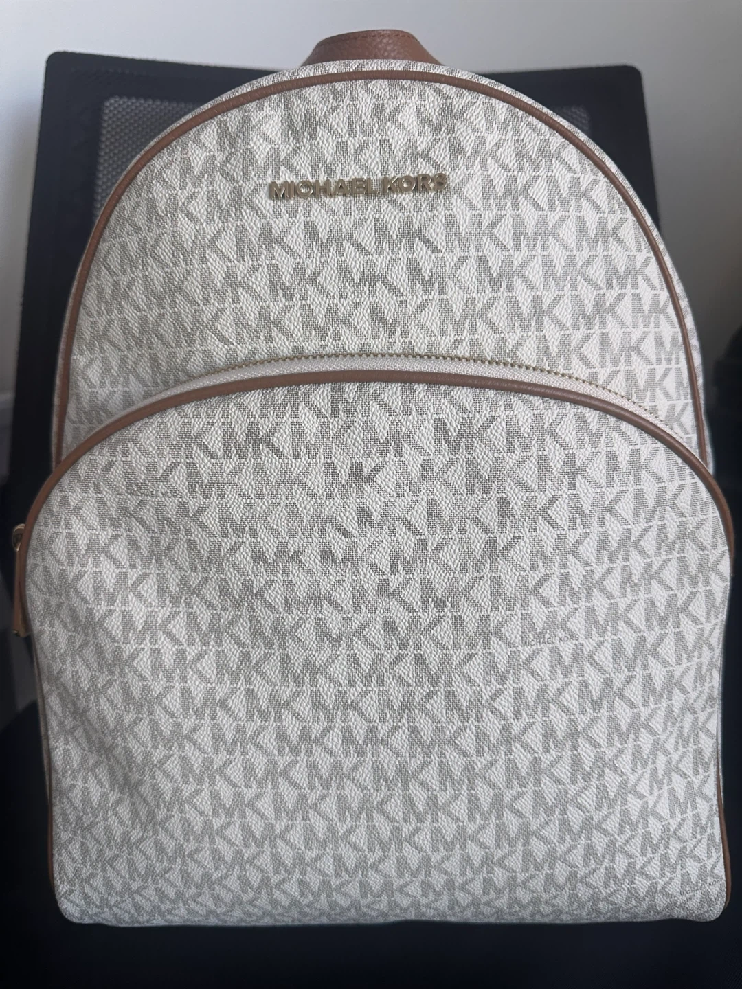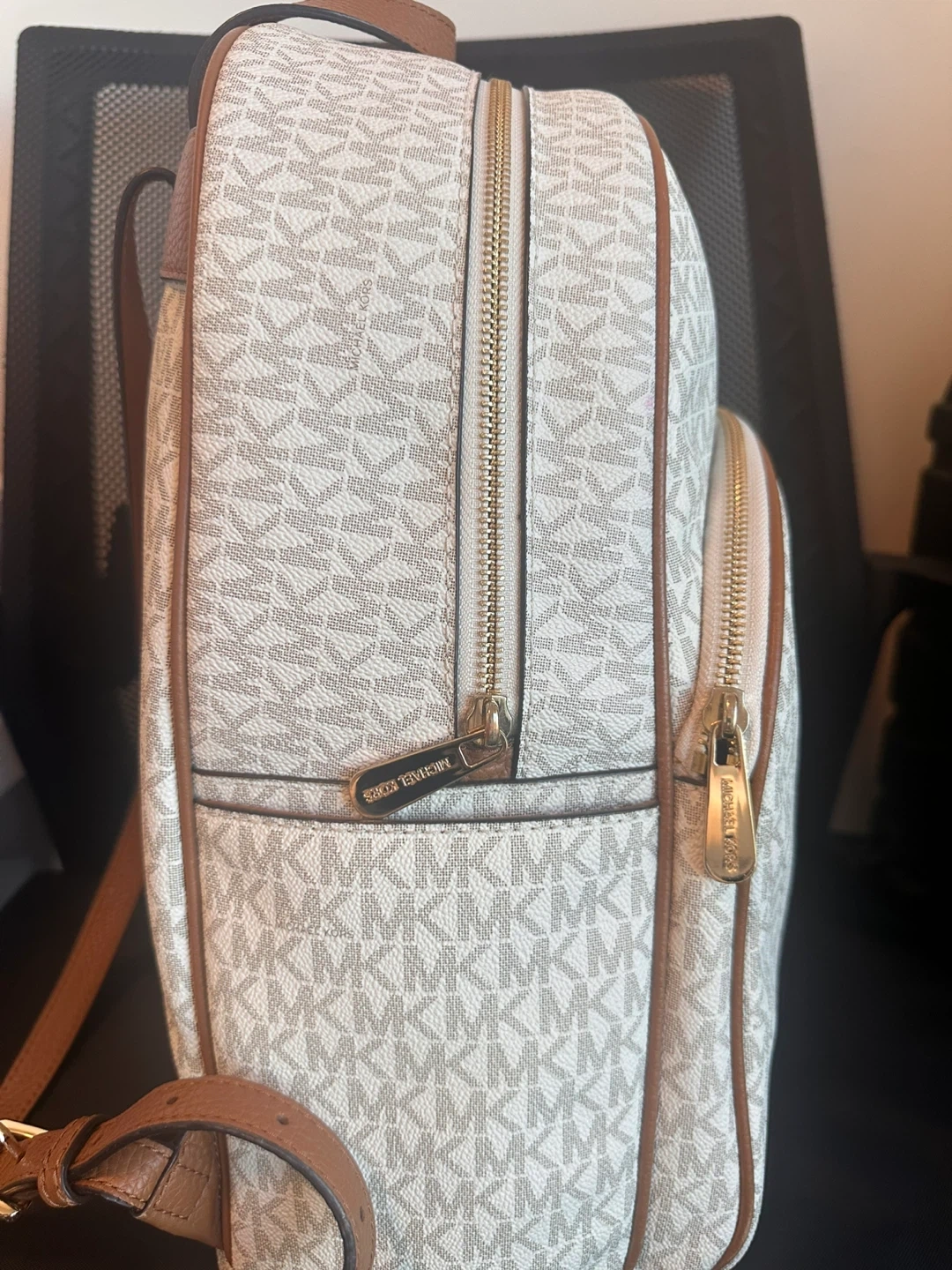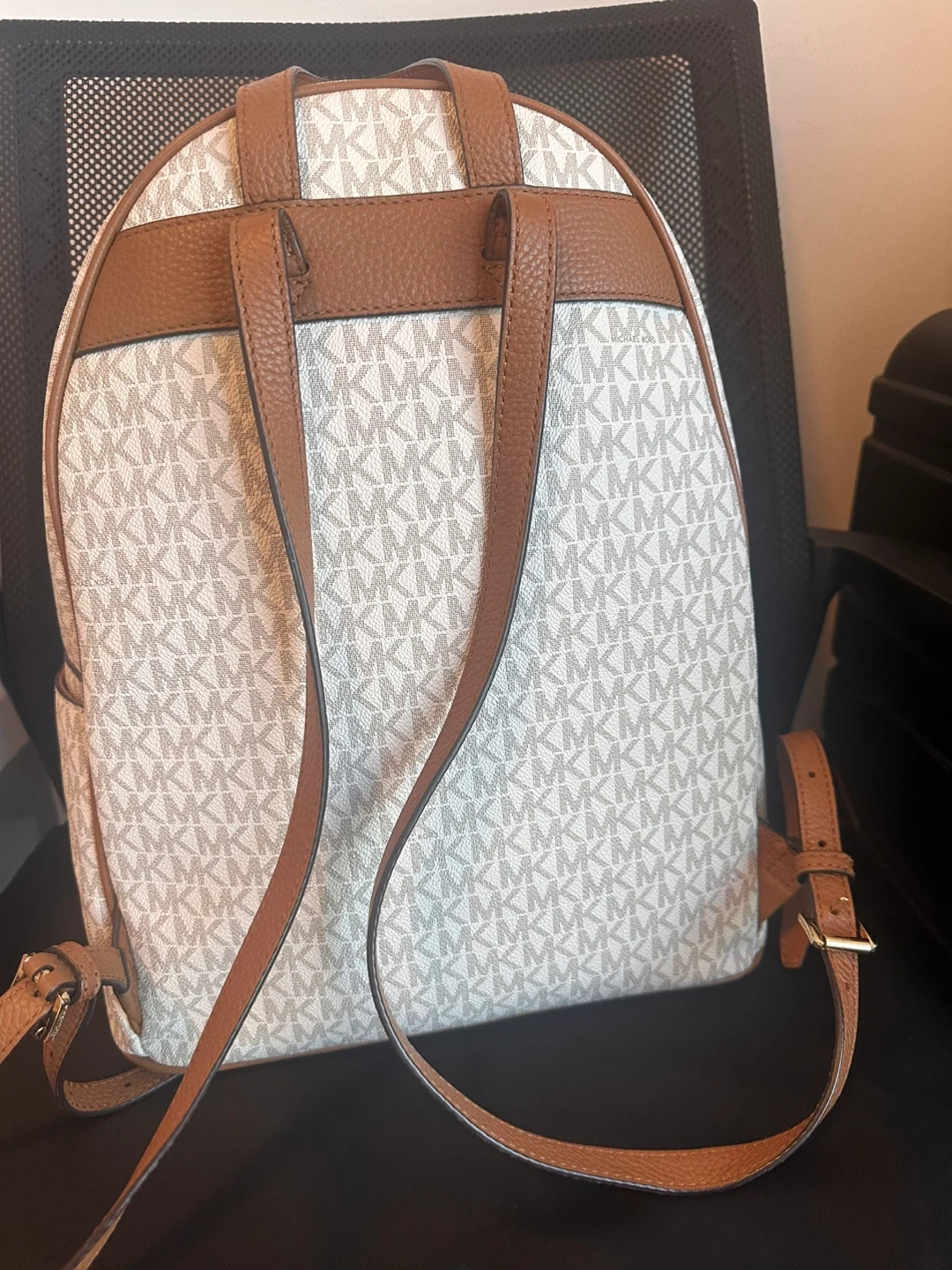 Selling a gently used Michael Kors backpack. It features a white and brown colour scheme with the MK logo pattern throughout. It's in great condition and ready for a new home! Ideal to school ๐