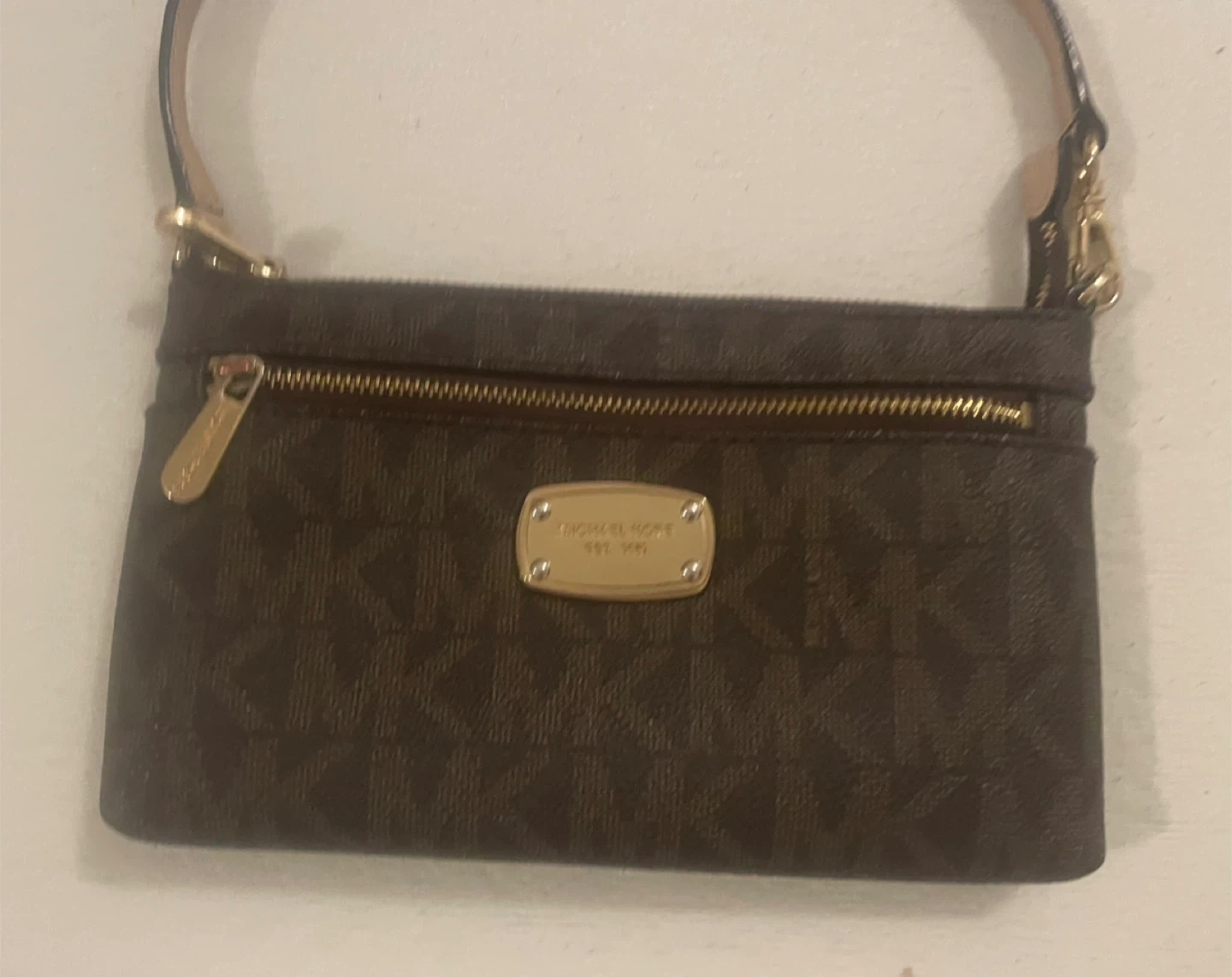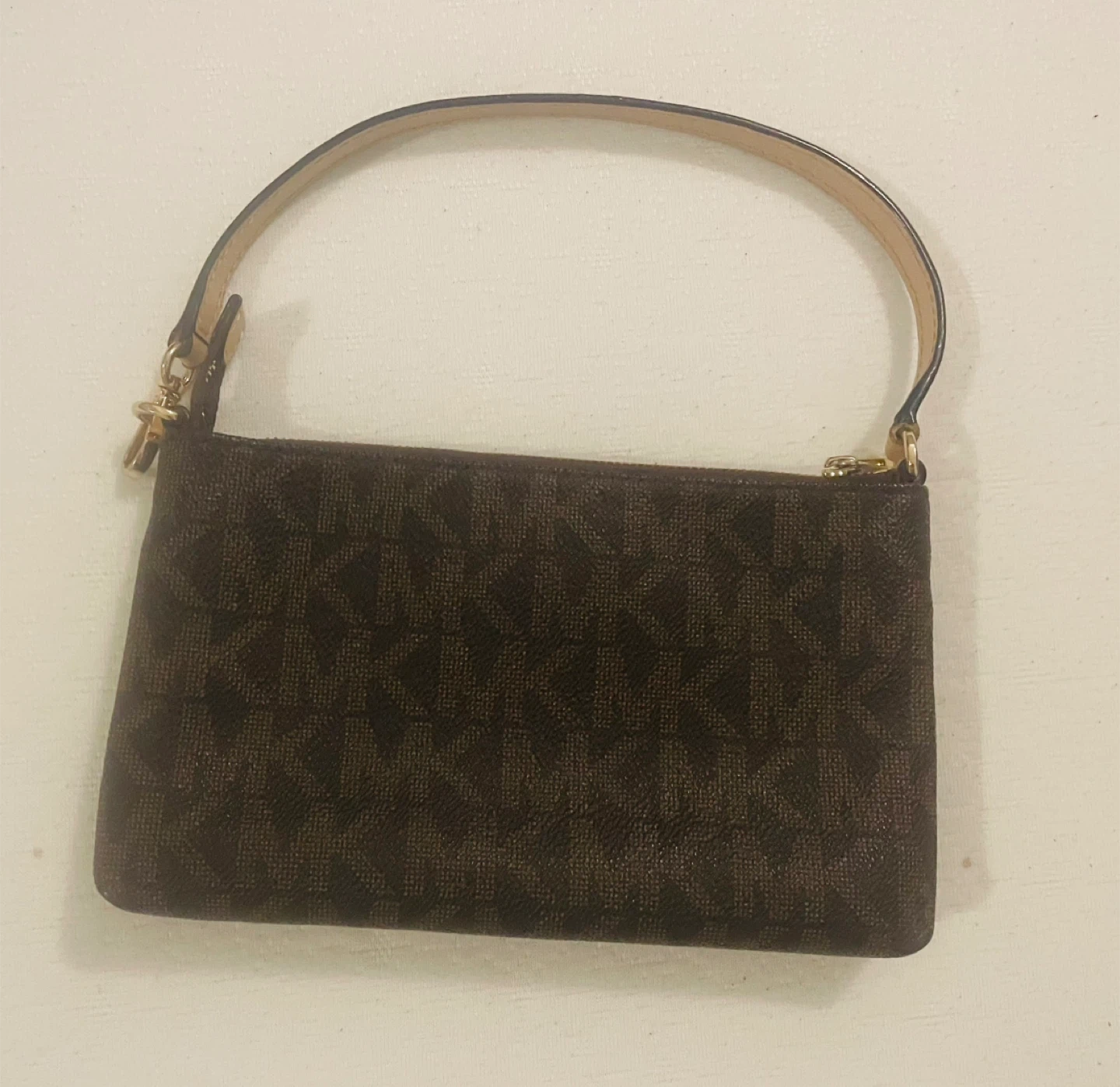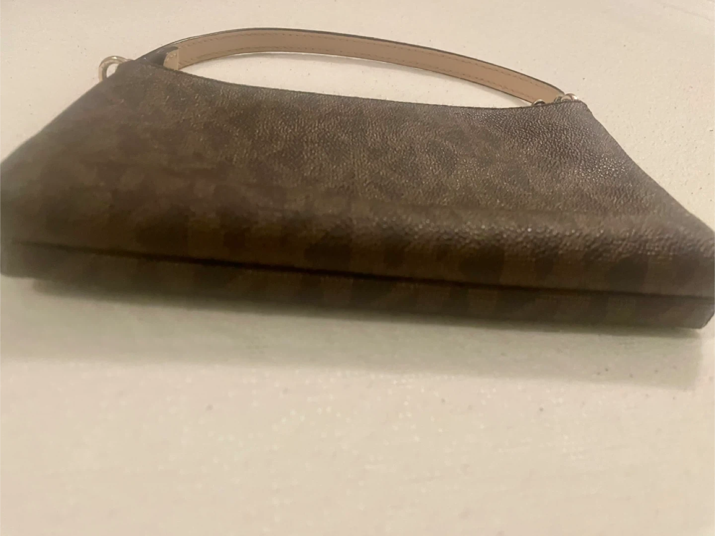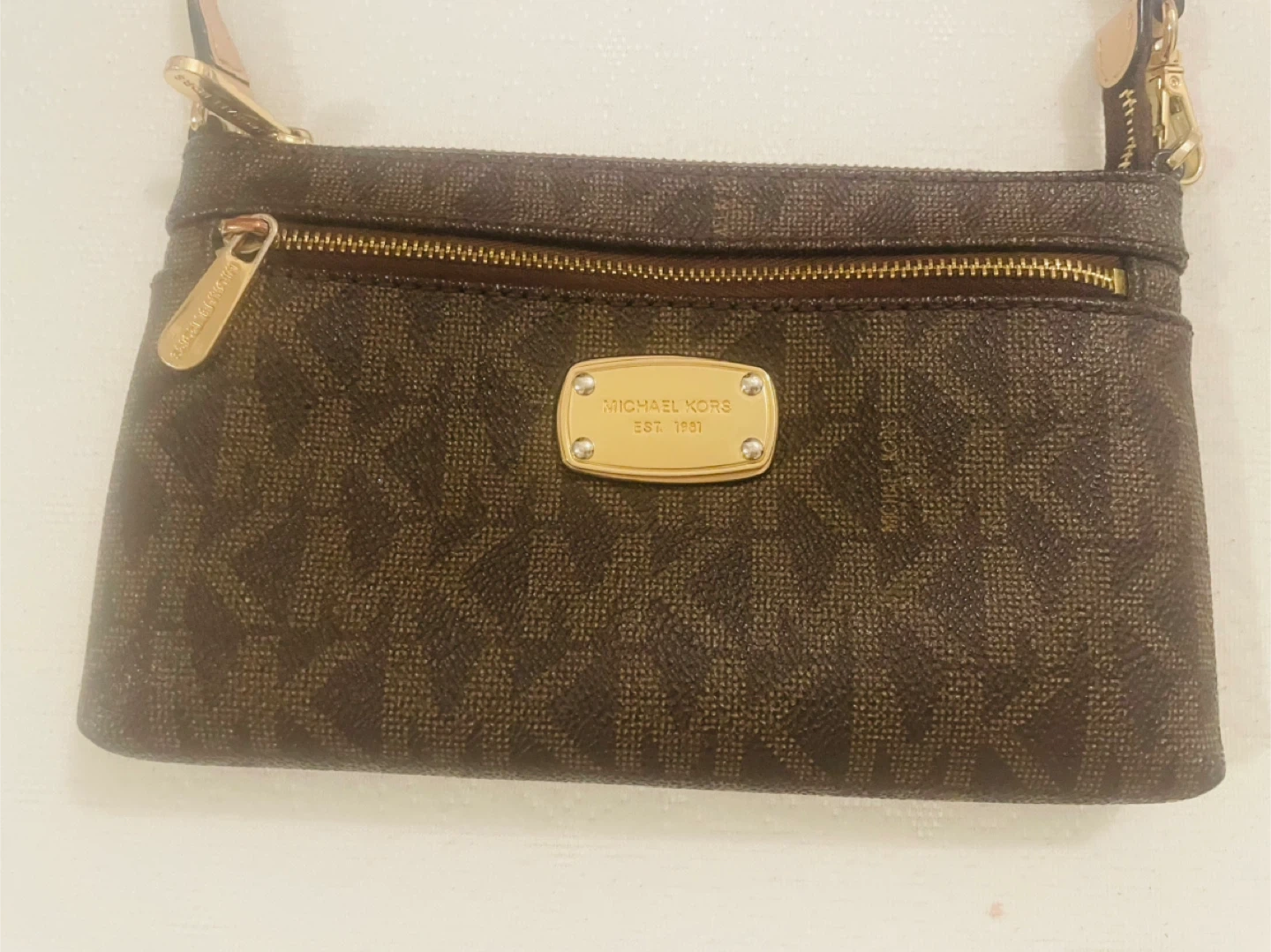 Selling a gently used Michael Kors handbag in a brown monogram print! It's a stylish and compact bag, perfect for carrying your essentials. The bag features a zip closure and the iconic Michael Kors logo plate. It's in great condition and ready for a new home!