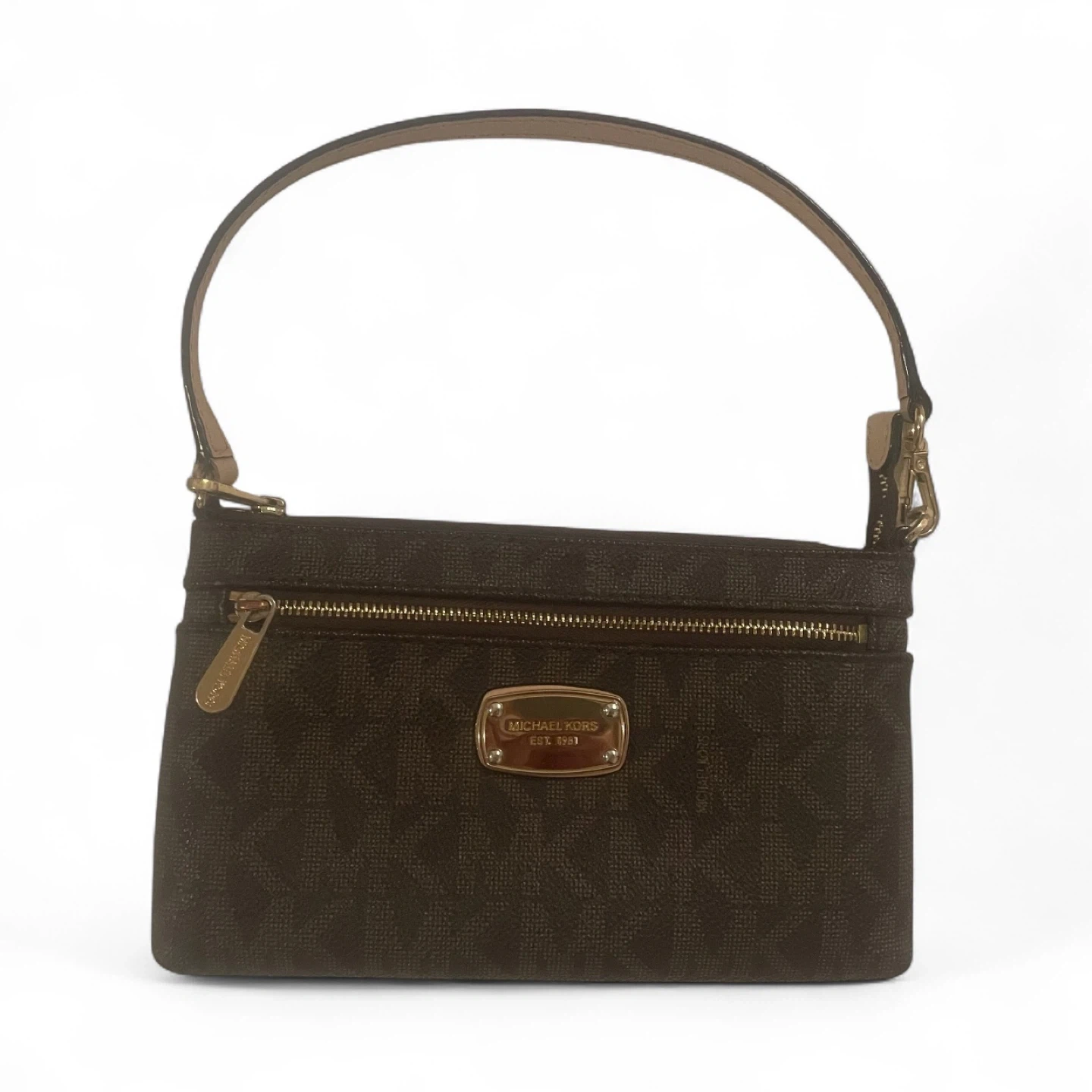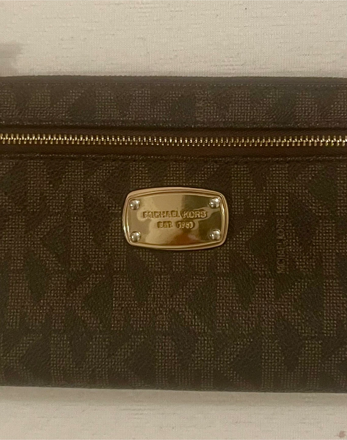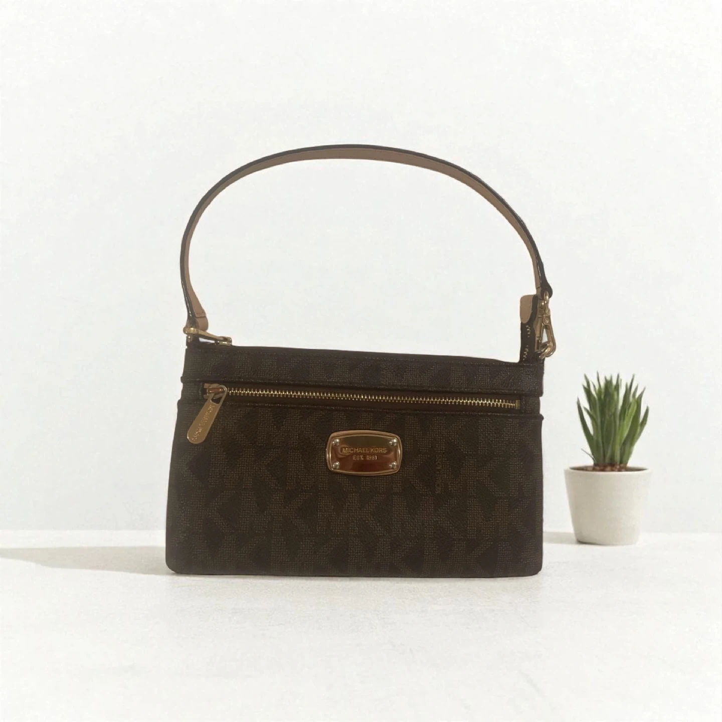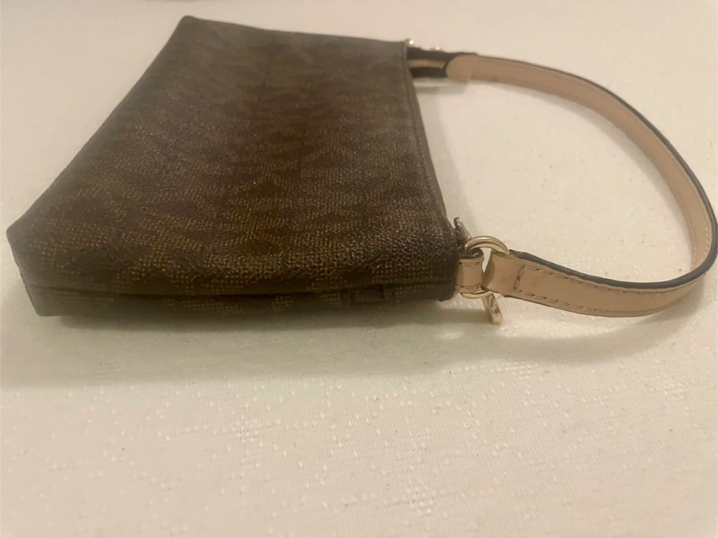 Selling a gently used Michael Kors handbag in a brown monogram print! It's a stylish and compact bag, perfect for carrying your essentials. The bag features a zip closure and the iconic Michael Kors logo plate. It's in great condition and ready for a new home!