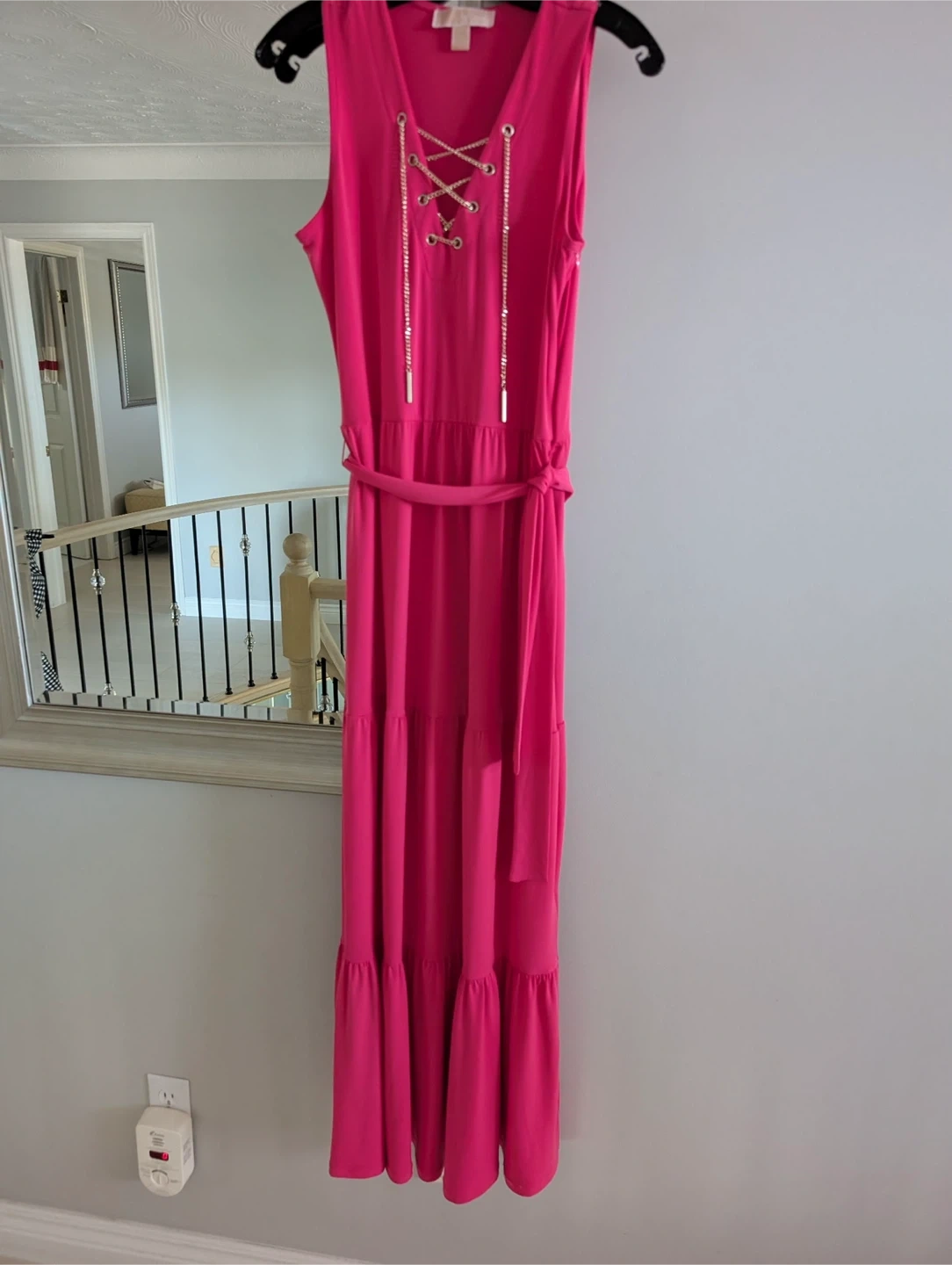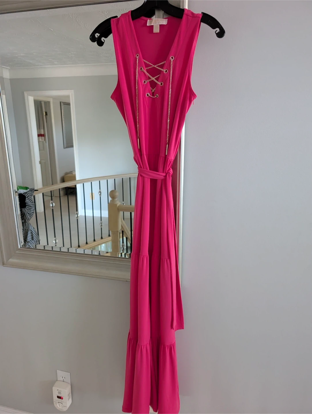 Selling a beautiful Michael Kors maxi dress in a vibrant pink colour! It's a size M and features a flattering silhouette with a tie waist. Perfect for summer days or evenings out!